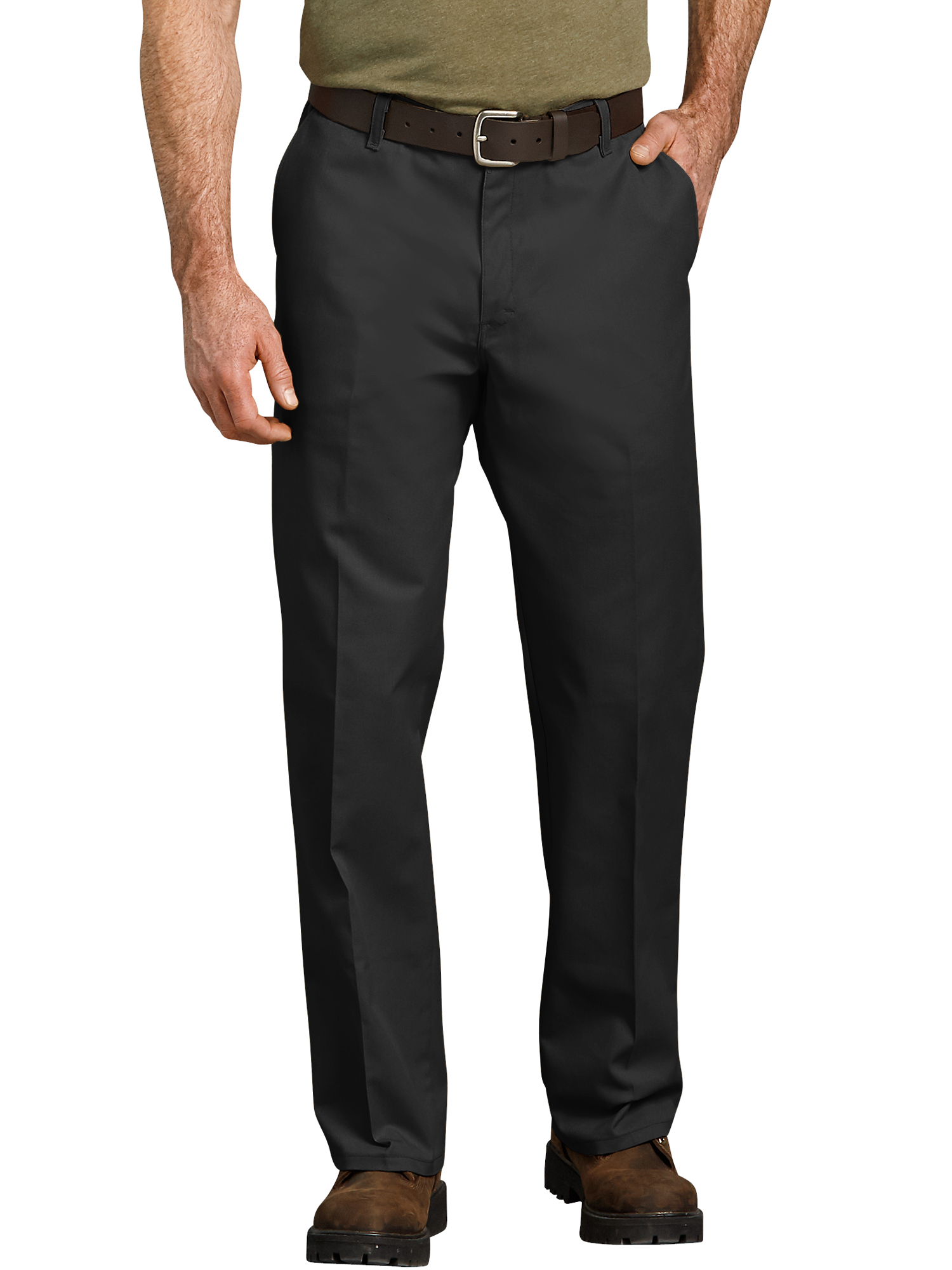 Update your wardrobe with the stylish and comfortable Genuine Dickies Flat Front Flex Pant. Designed in a cotton-polyester blend fabric, it resists wrinkles and abrasions. Better yet, these Dickies men's pants can be worn straight out of the wash. Carry all your belongings, from your wallet to your keys in the multi-use pockets. It has a minimalistic look with single button closure with zipper flies. This wrinkle-free men's pants design includes belt loops for your convenience. These Genuine Dickies Flat Front Flex Pant With Stain Release, are Moisture Wicking And Wrinkle Resistant.Specifications