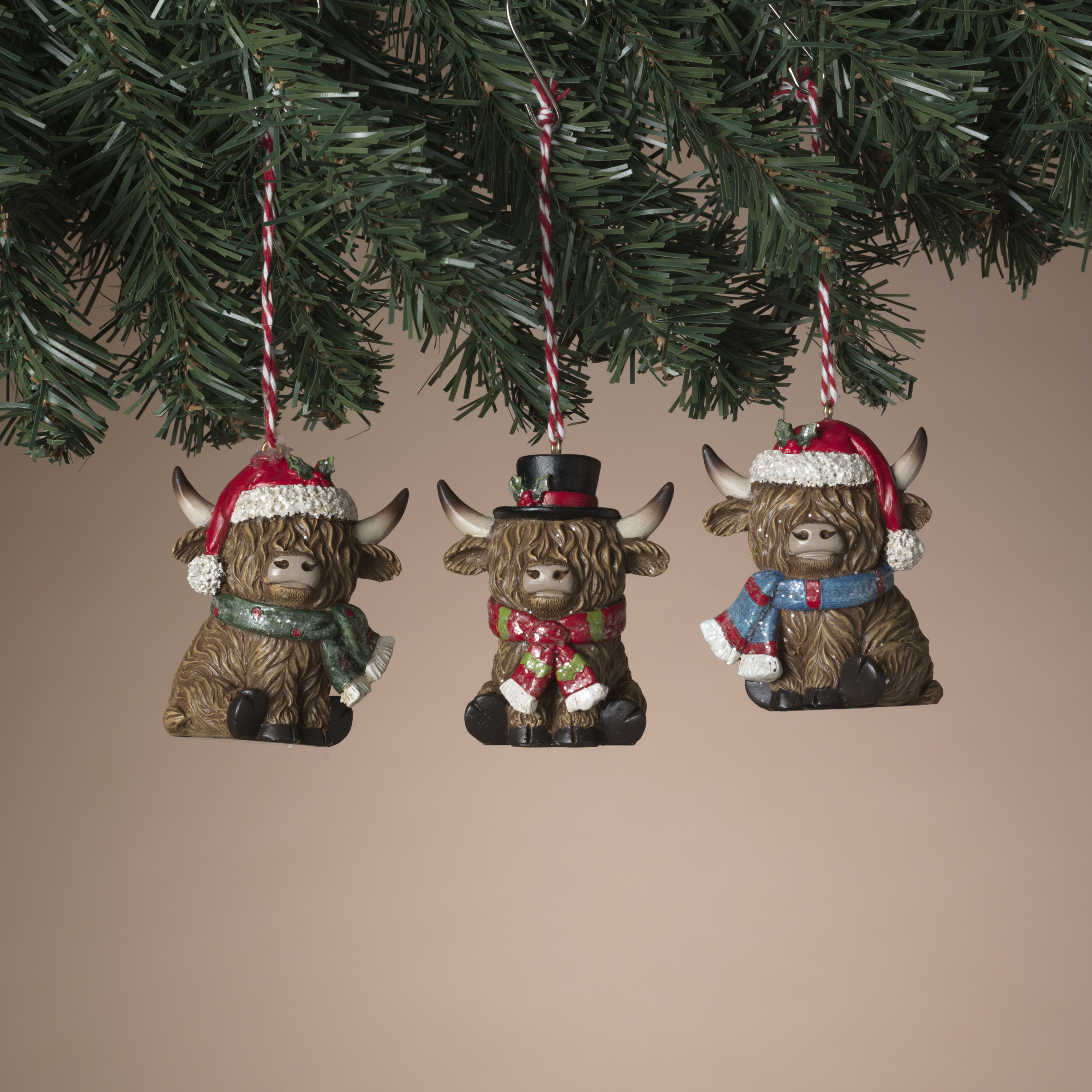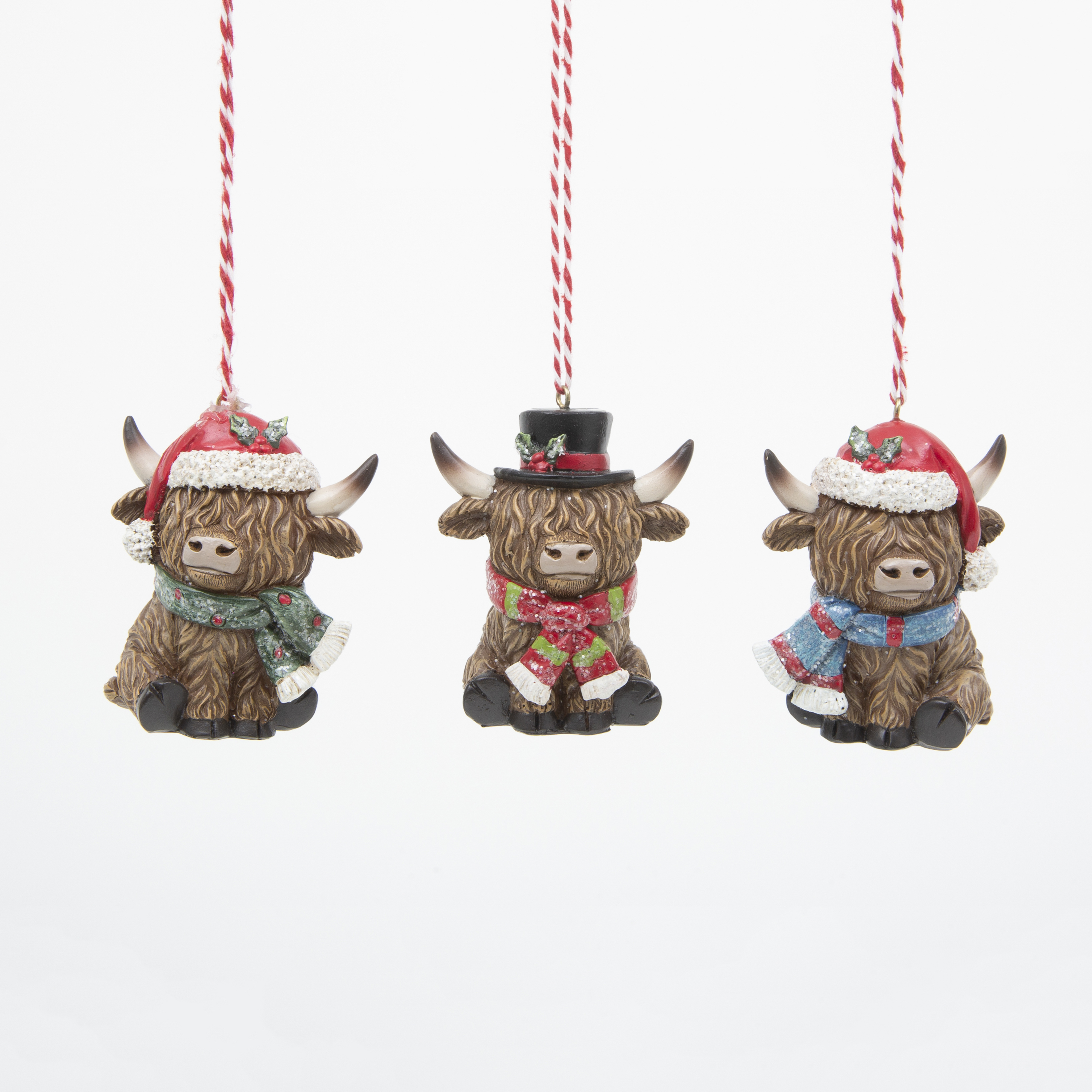 Color choice not guaranteed for online orders 2.9"H Resin Holiday Highland Cow Ornament, 3 AssortedSpecifications