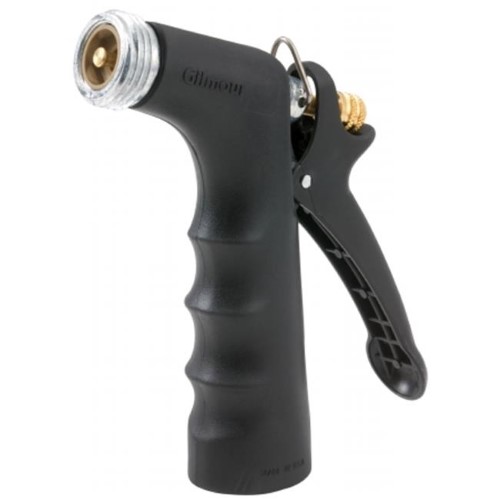 This water spray nozzle has a comfort grip consisting of a black vinyl cushion. Like most water spray nozzles, this hose gun is a full flow nozzle. It has a threaded front which is used to attach watering accessories. Features and Benefits: Brass valve, adjustment nut, and stainless steel spring, has a leak-proof seal.Specifications