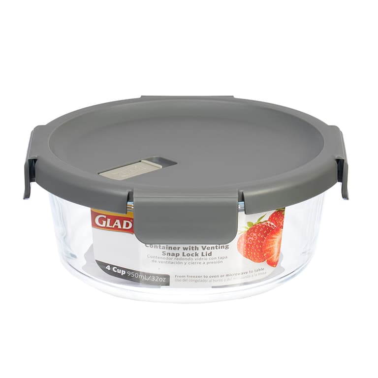 Glad glass 4 cup round food stoarge container with a vented lid.Specifications
