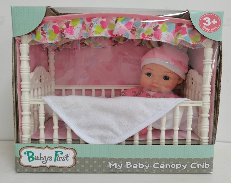 Baby’s First Canopy Crib w/ 9 Doll - Canopy Crib includes a 9 soft body baby doll dressed in pink unicorn pajamas, a large baby blanket and a four-post canopy crib. The Canopy Crib doll makes a wonderful nap time companion for young children.Specifications