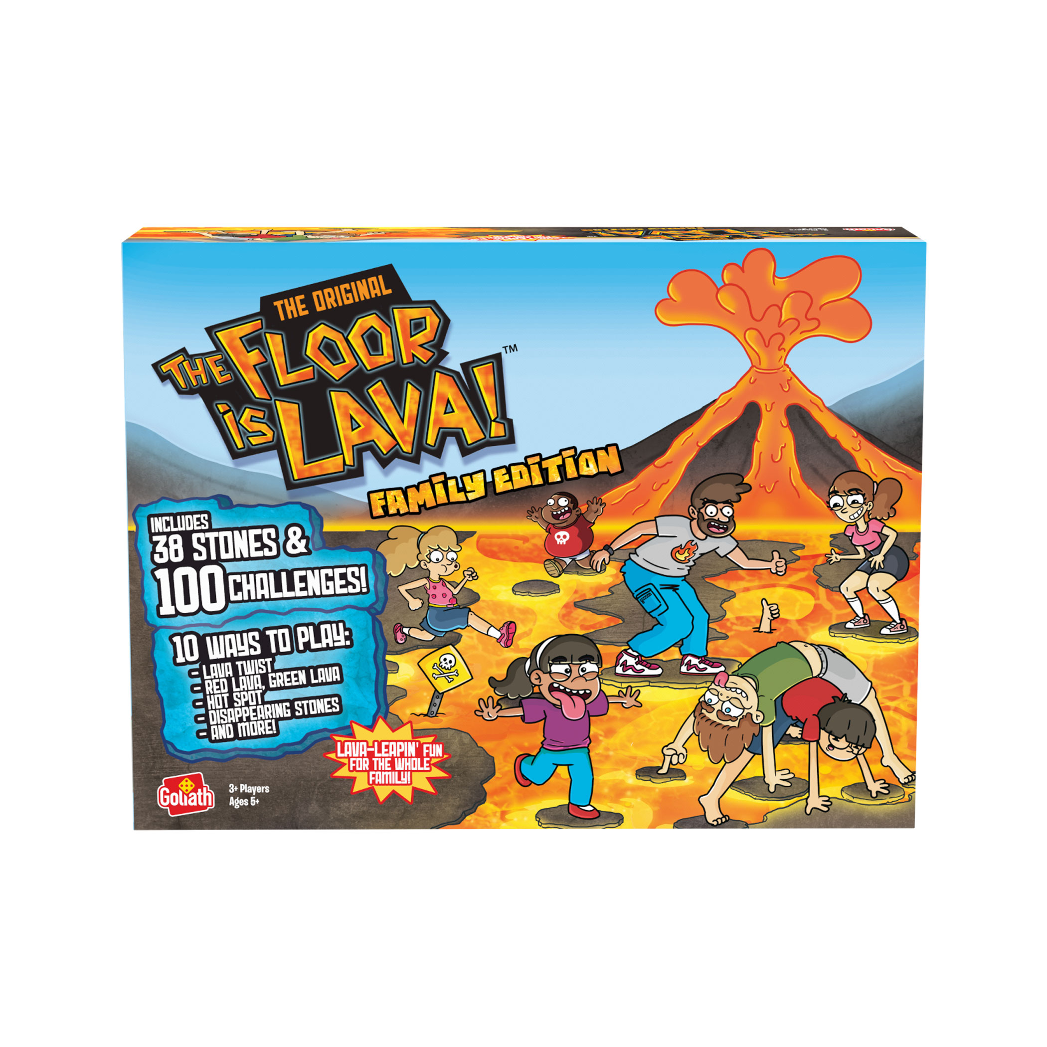 Everyone has played a version of this game as a child, most likely jumping all over the furniture in their living room trying to stay off the dangerous floor. In this Original The Floor is Lava! game, players must imagine the floor is molten hot lava, while spinning for their color and jumping along foam game pieces in order to reach safety. This family game incorporates physical activity, imagination and pure fun! Remember, DON’T TOUCH THE FLOOR! Includes 25 Colored Foam "Safety Stones", 27 Challenge Cards, 1 Game Spinner Card (with arrow and base), and Complete Instructions. Recommended for 2-6 players, ages 5 and up.Specifications