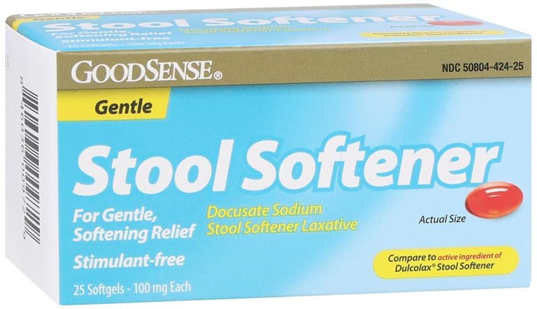 Compare to Active Ingredient in DulcoEase Stool Softener; For temporary relief of occasional constipation and irregularity; Stimulant-free; This product generally produces bowel movement in 12 to 72 hoursGoodSense Gentle Stool Softener Softgels, Docusate Sodium, 100 mg Softgels, For Gentle Soothing Relief, Gluten Free, 25/each count.