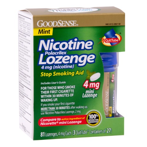GoodSense Nicotine Polacrilex Lozenge 4 mg (nicotine), Mint Mini Lozenge reduces withdrawal symptoms, including nicotine craving, associated with quitting smoking. Compare to the active ingredient of Nicorette mini Lozenge.Specifications
