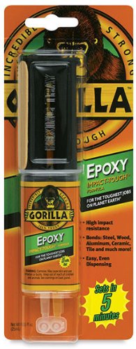 Gorilla Epoxy's two-part formula provides high impact resistance strength to handle the toughest projects. The easy-to-use reusable syearinge dispenses equal amounts of resin and hardener. Plus, it's fast! Gorilla Epoxy sets in 5 minutes and can be handled in 90 minutes. Low VOC and non-toxic once cured, Gorilla Epoxy is safe for everyday handling. It's gap-filling capabilities and all purpose formula is perfect for multiple surface applications, easily bonding steel, wood, aluminum, stone, glass, brick, concrete, ceramics and much more. Sets in 5 minutes. Gap filling and drillable. Special impact-resistant formula. Water and solvent resistant. Reusable syringe.Specifications