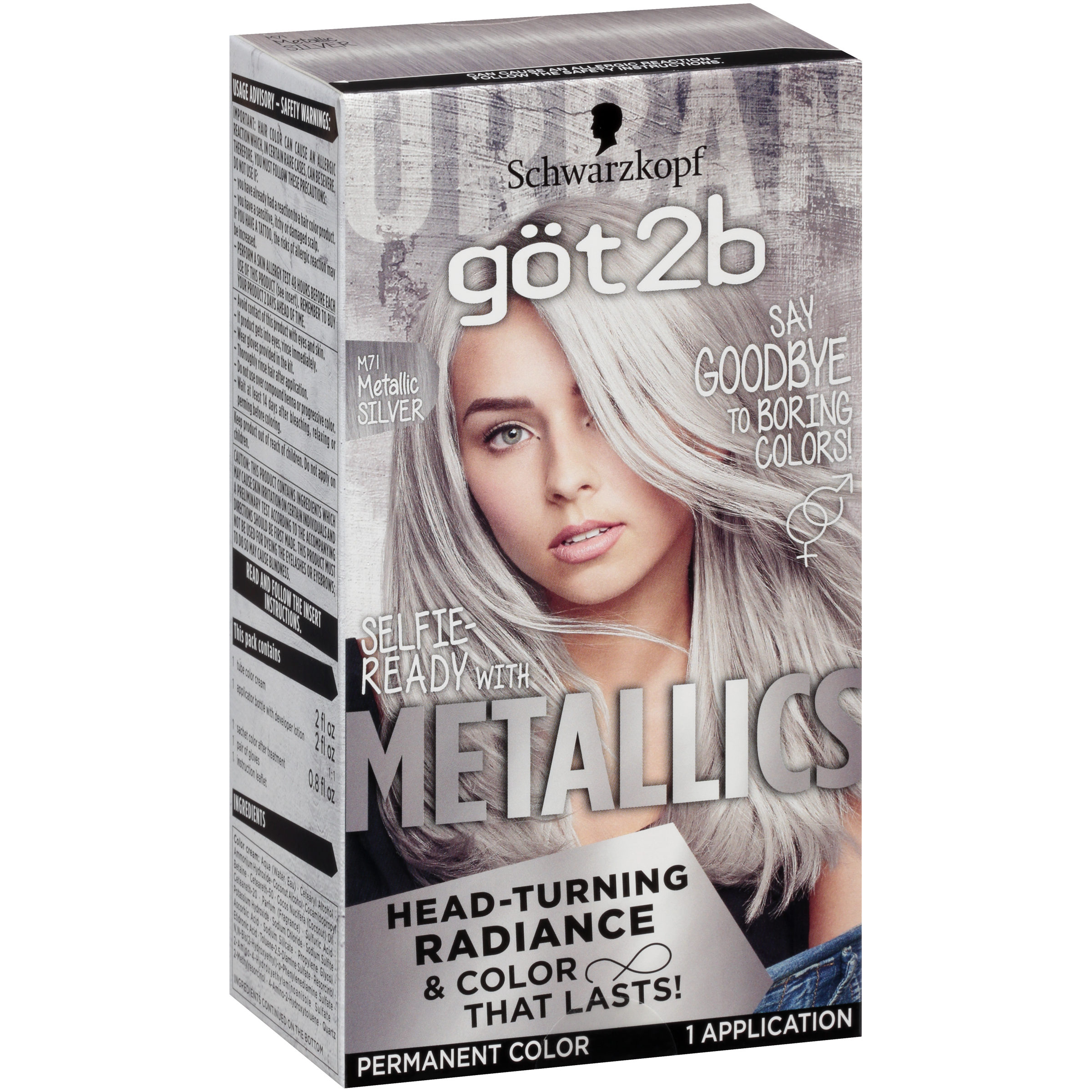 Metallics Permanent Hair Color - Boost your hair color with unique metallic radiance with got2b Metallics Permanent Hair Color.For a multi-dimensional metallic lookHead-turning radiance and anti-fading effect for permanent hair dye that lasts. Formulated with metallic-shine booster for cool, shimmering tones.Specifications