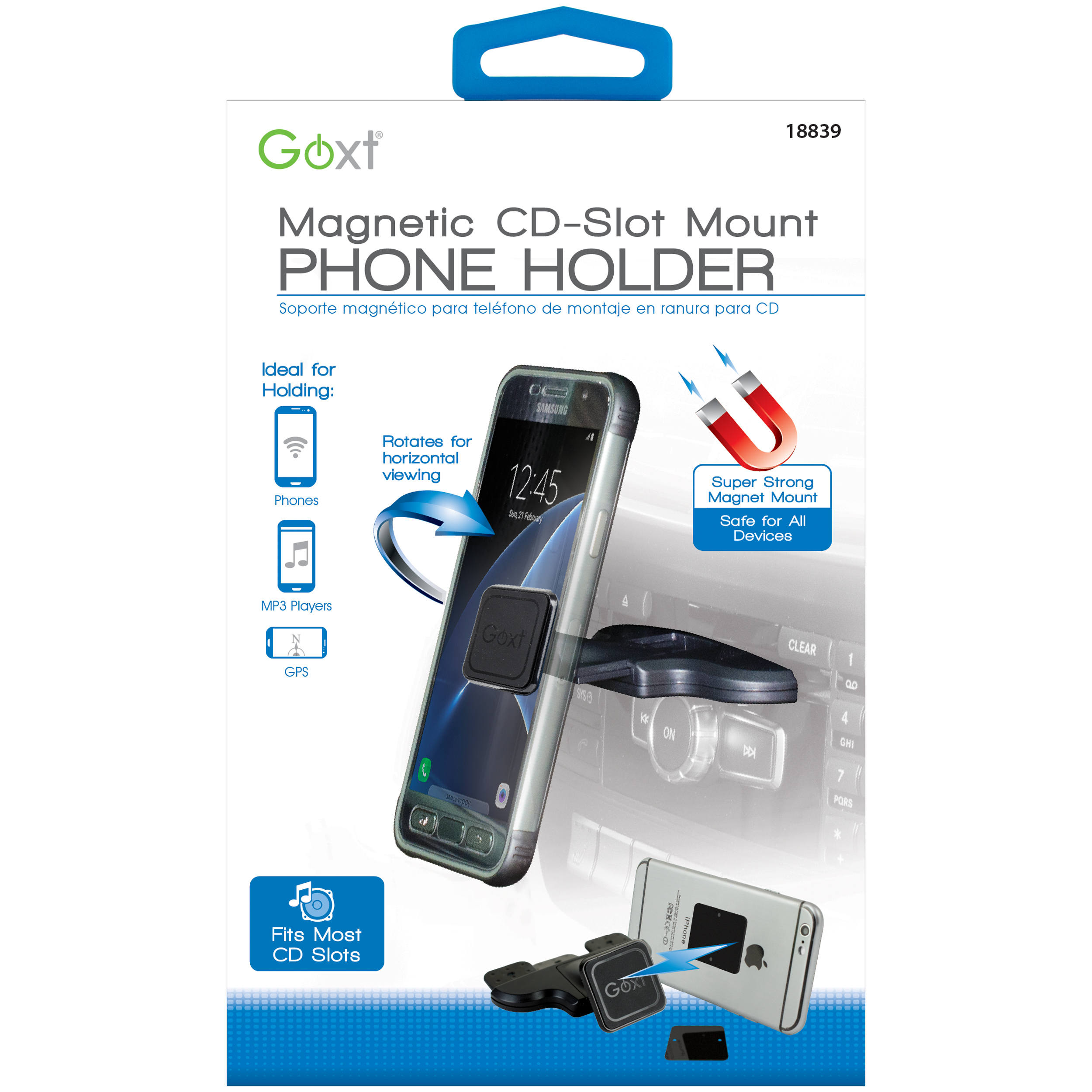 The GoXT magnetic CD mount phone holder is designed to effortlessly hold any mobile device. It works with phones of all sizes and is compatible with most tablets and other digital devices. The phone mount easily slides into your car's CD slot for a secure hold and placement that will not obstruct your view. Installation is easy. Simply stick the metal disc with 3M adhesive in between the case and your smartphone, on your case, or directly on your mobile device and you're ready to go!Specifications