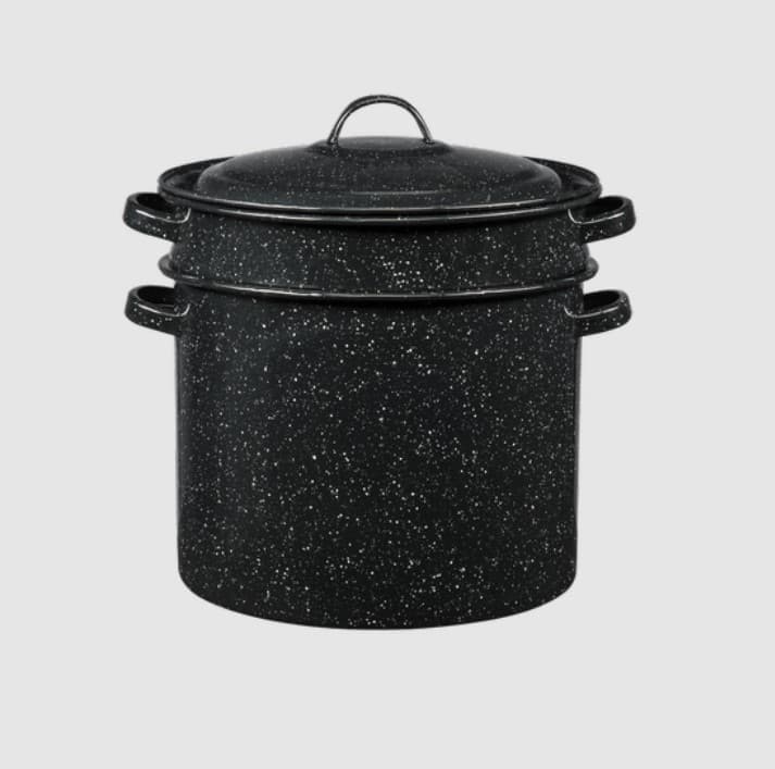 The Granite Ware Blancher with Drainer Insert has a 7.25-quart capacity - the perfect size for preparing fruits and vegetables for canning or freezing. The porcelain on steel blancher includes a pot with side handles, a lid and a drainer insert. Porcelain is fused to the steel at 2,000 degrees Fahrenheit producing a non-porous, inert glass surface that is naturally non-stick. Porcelain can chip if dropped, however this does not reduce the effectiveness of the cookware.Specifications