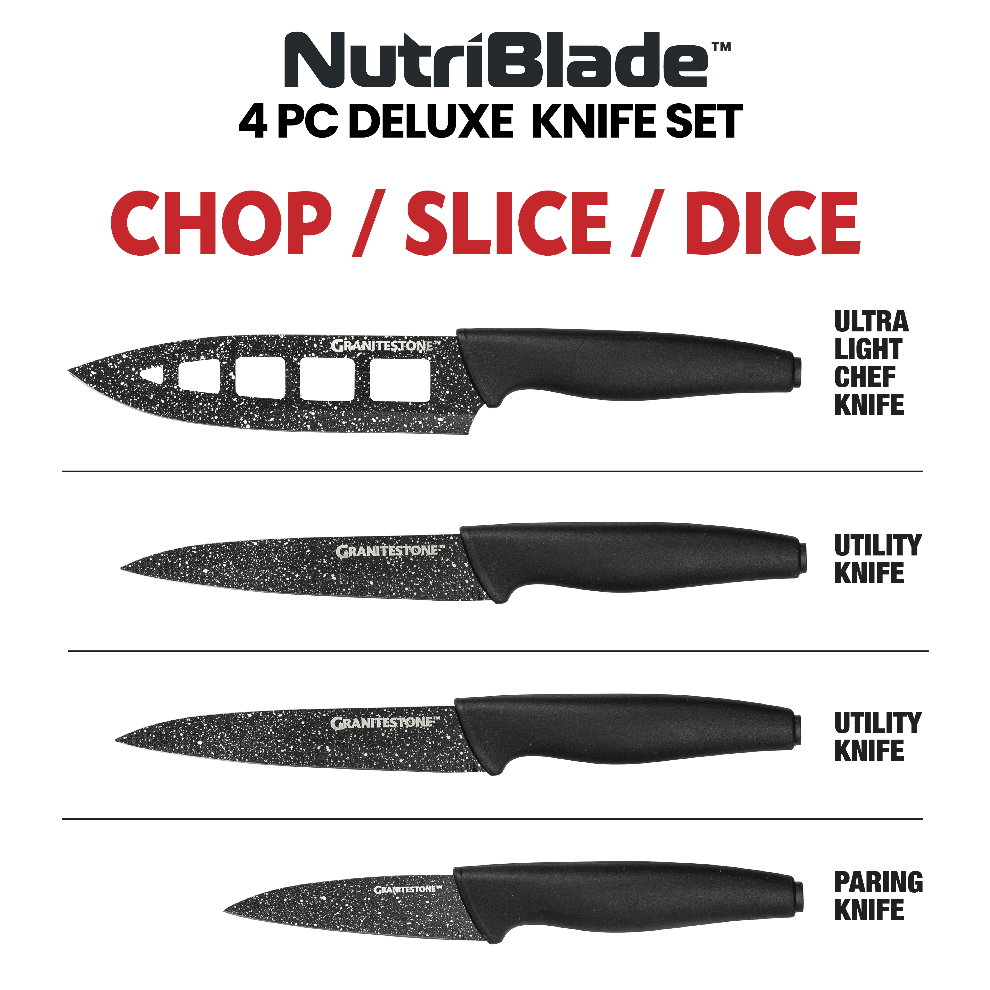 Chop, Slice and Dice like a pro with our new Granite Stone Knives! These high-grade stainless-steel blades are non-stick and dishwasher safe. Prep a meal with this set of all knives with rubberized handles for comfort and easy grip. Once you are finished just pop them in the dishwasher for easy clean up! Included in this set are your most important knives to get you cooking in the kitchen.Specifications