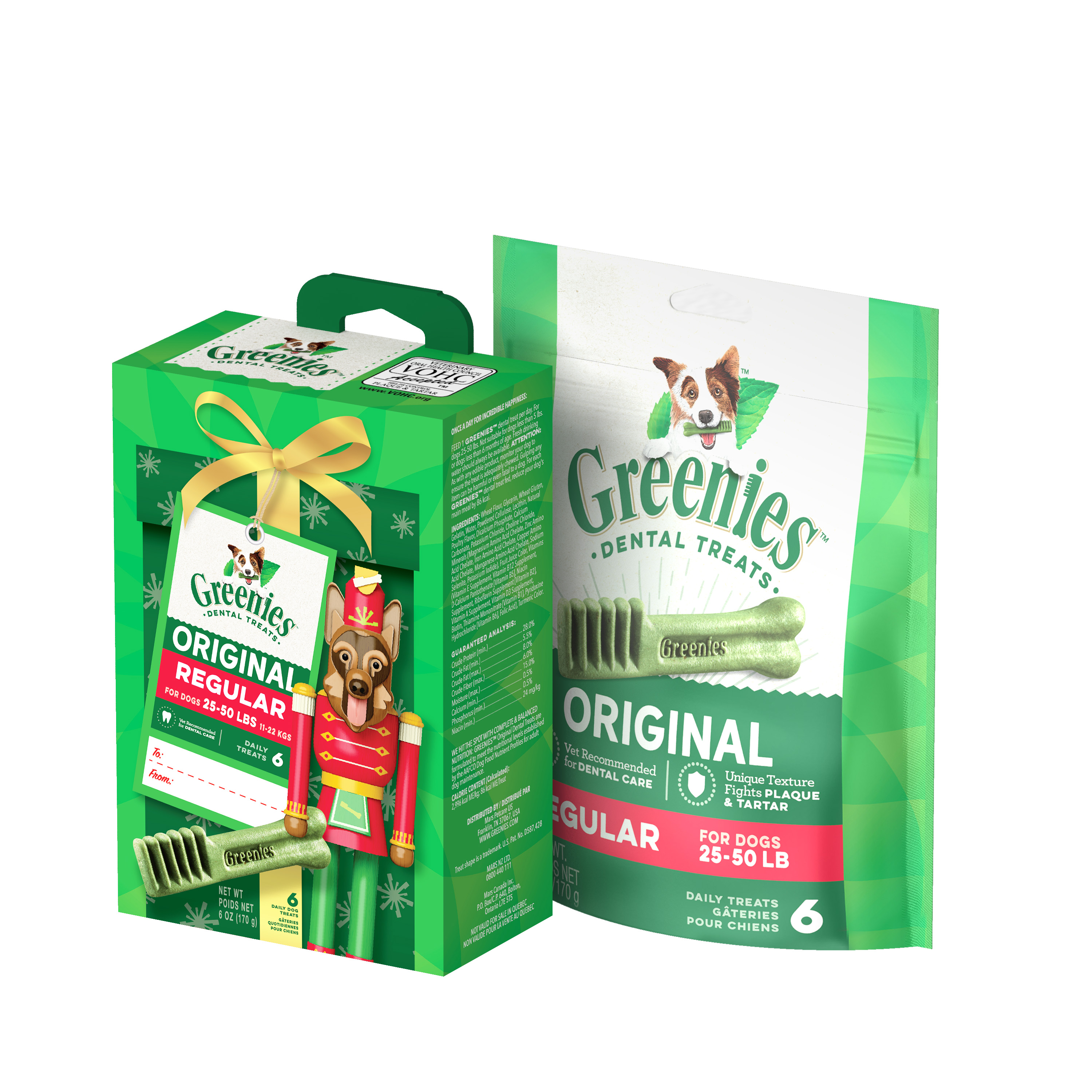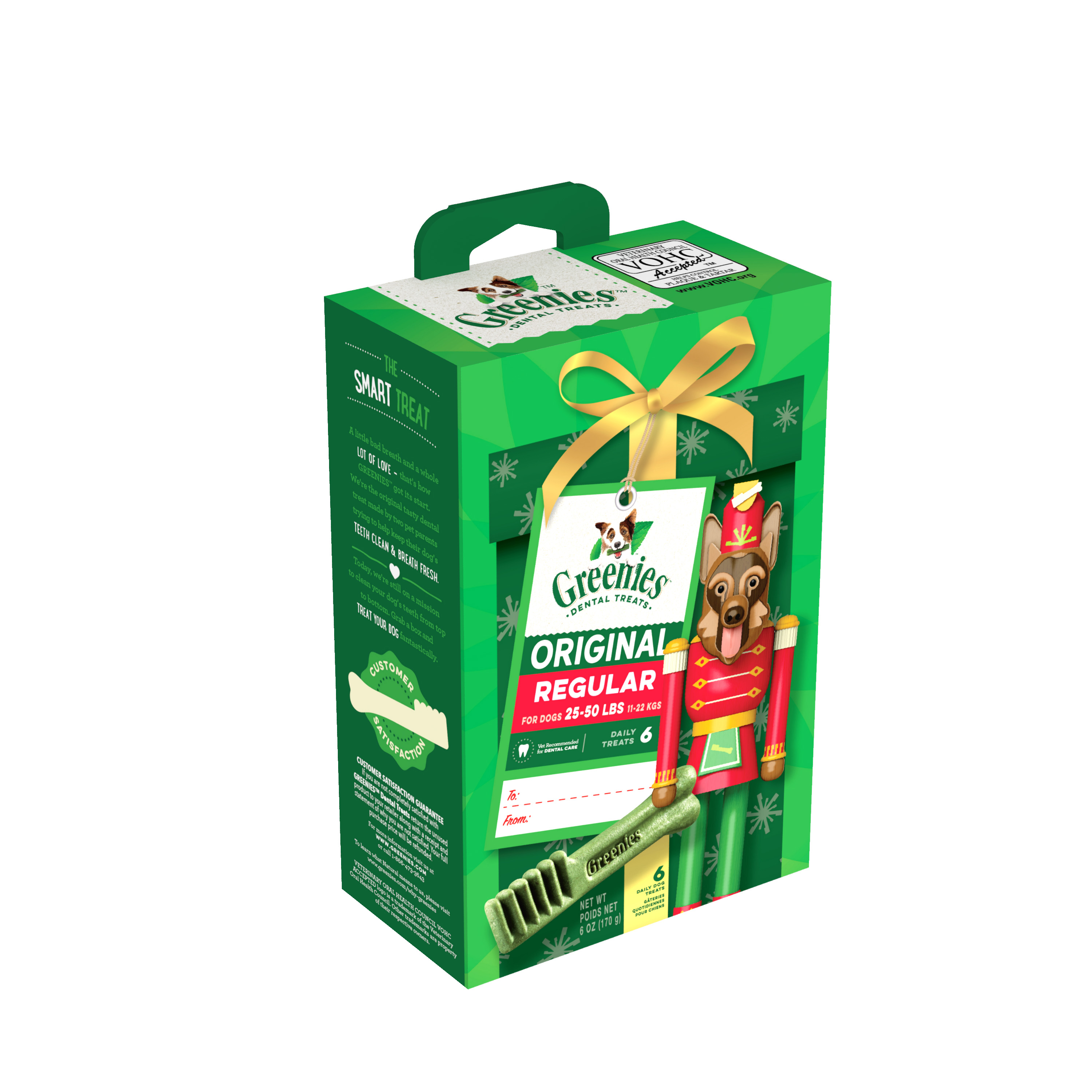 FOR DOGS 25-50 LBS; GREENIES Original Natural Dental Dog Chew Holiday Dog Treats Gift Pack; Perfect festive stocking stuffer for your furry friend; Veterinarian recommended for dental care