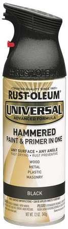 Rust-Oleum Universal All Surface Hammered Spray Paint and Primer in 1 can be used for both interior and exterior environments on virtually any surface: vinyl, metal, plastic, fiberglass, concrete, glass, wicker and wood. Oil based formula provides superior coverage up to 15 sq. ft., durability and protection from rust. Paint dries to the touch in 30 minutes. Specially designed nozzle eliminates finger fatigue, protects against dripping and sprays from any angle - even upside down for hard to reach areas.Specifications