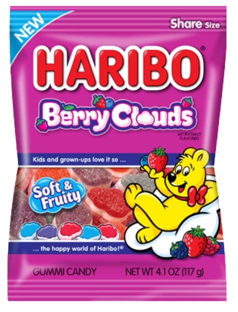 Get ready to float into cloud nine! Introducing NEW HARIBO Berry Clouds, featuring a triple-layer foam gummi with a soft, cloud-like texture. Every bag of Berry Clouds packs Blueberry, Wildberry, and Strawberry flavors into dreamy cloud shapes.Specifications