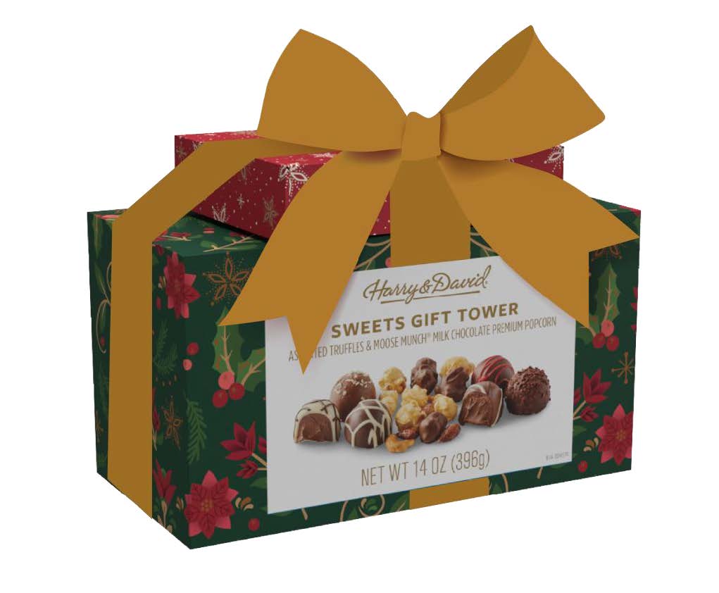 SHARE A HOLIDAY GIFT THAT’S FILLED WITH SOME OF OUR MOST ICONIC SNACKS AND SWEETS. EACH BEAUTIFUL BOX IN THIS TOWER IS BRIMMING WITH GOODIES LIKE MILK CHOCOLATE MOOSE MUNCH PREMIUM POPCORN AND ASSORTED SIGNATURE TRUFFLES WHICH ARE MADE WITH A PROPRIETY BLEND OF GOURMET CHOCOLATE. TO MAKE THIS GIFT EXTRA FESTIVE, IT'S TOPPED WITH AN ELEGANT HAND TIED BOW.Specifications
