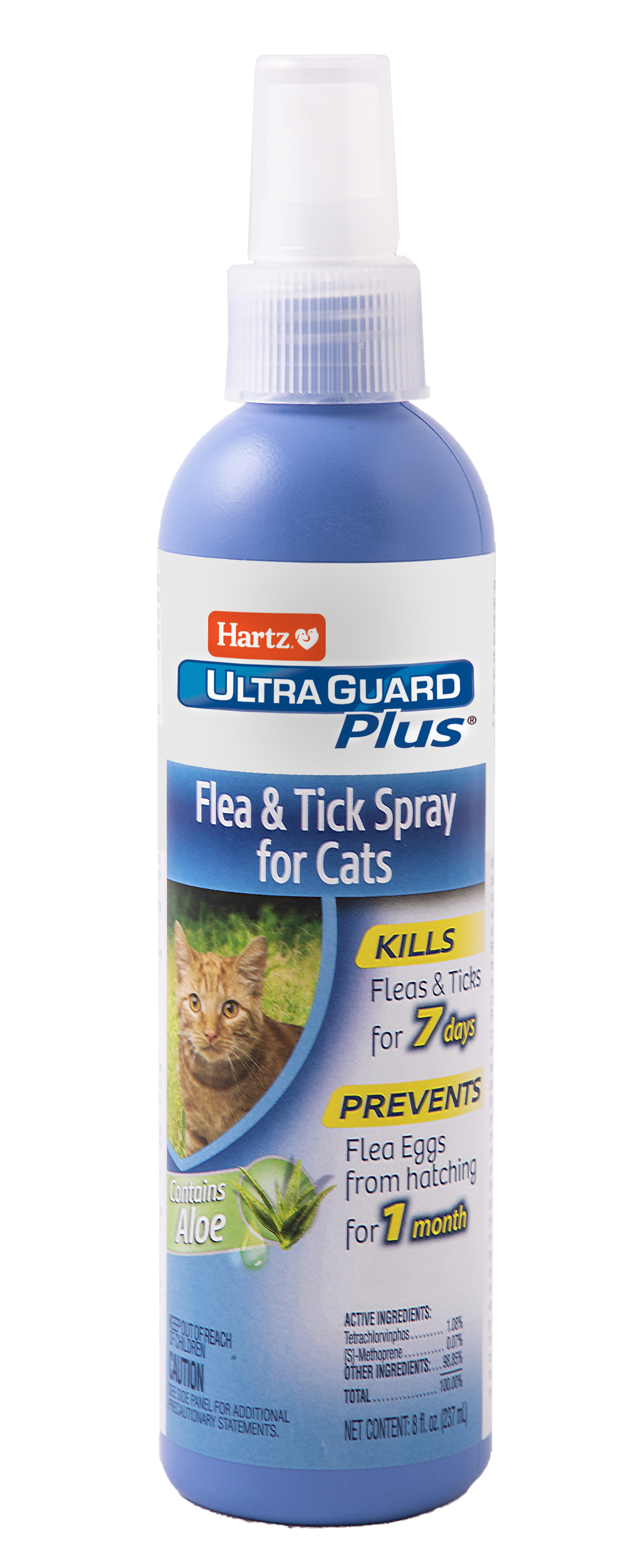 Hartz UltraGuard Plus Spray for Cats is a water-based spray kills fleas and ticks from hatching for 7 days PLUS prevents flea eggs for up to 30 days. In addition, this spray contains aloe to help calm and soothe itchy, irritated skin caused by fleas & ticks. For use on kittens 12 weeks of age or older.Specifications