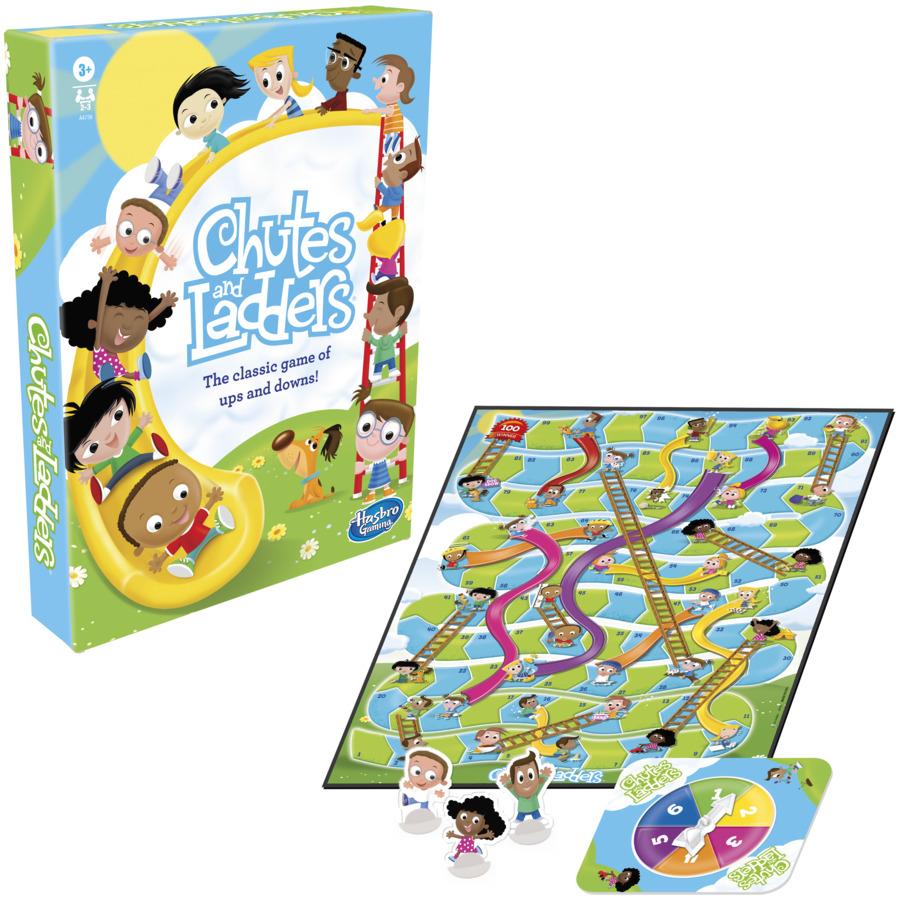 Children can practice counting and number recognition as they travel along the gameboard to get to the top; Players scramble to the top of the gameboard without slip-sliding down! Land on good deeds to climb ladders but watch out for the chutes; Spin the spinner and move the pawn up the ladders and down the chutes. Chutes and Ladders is a classic game that children enjoy playing over and over