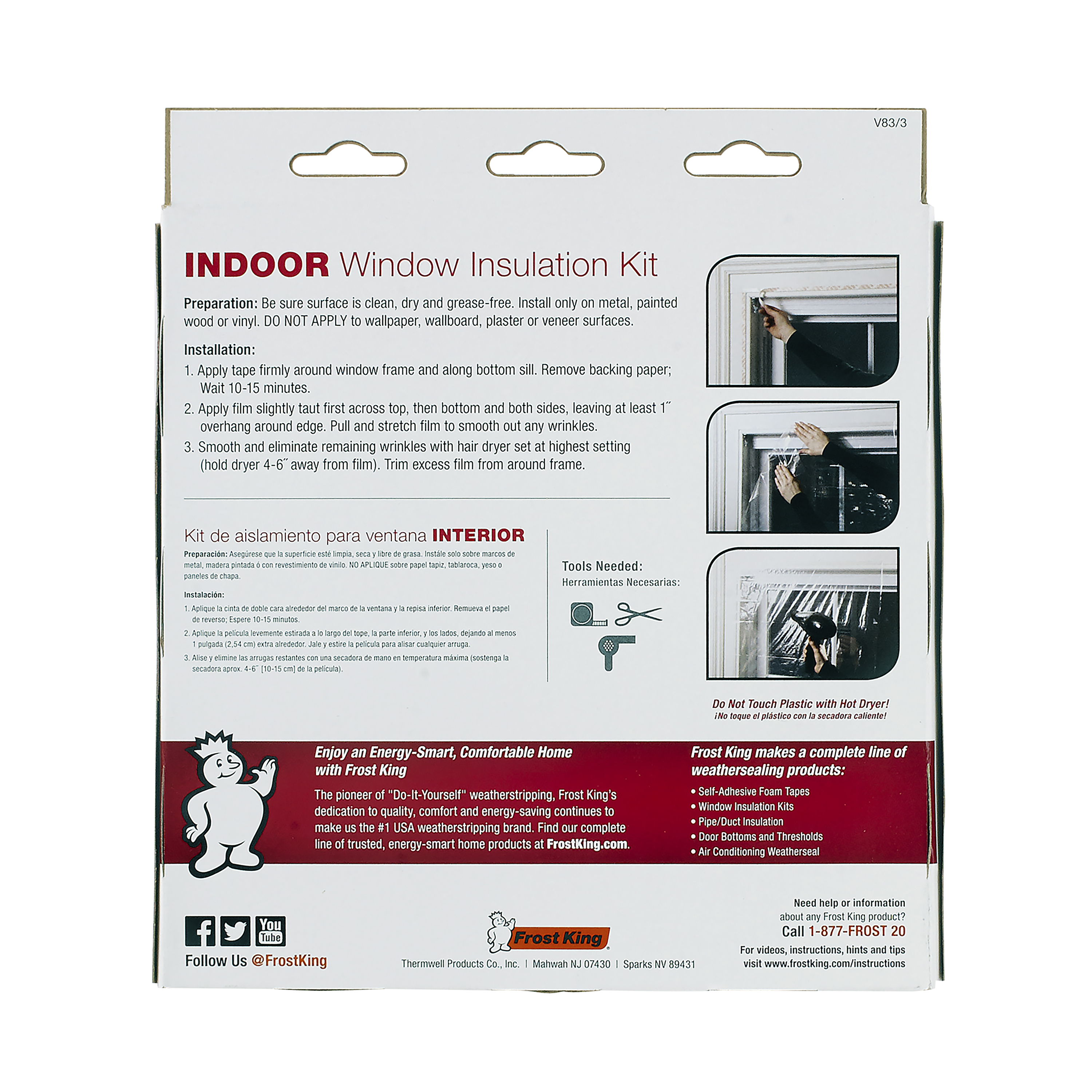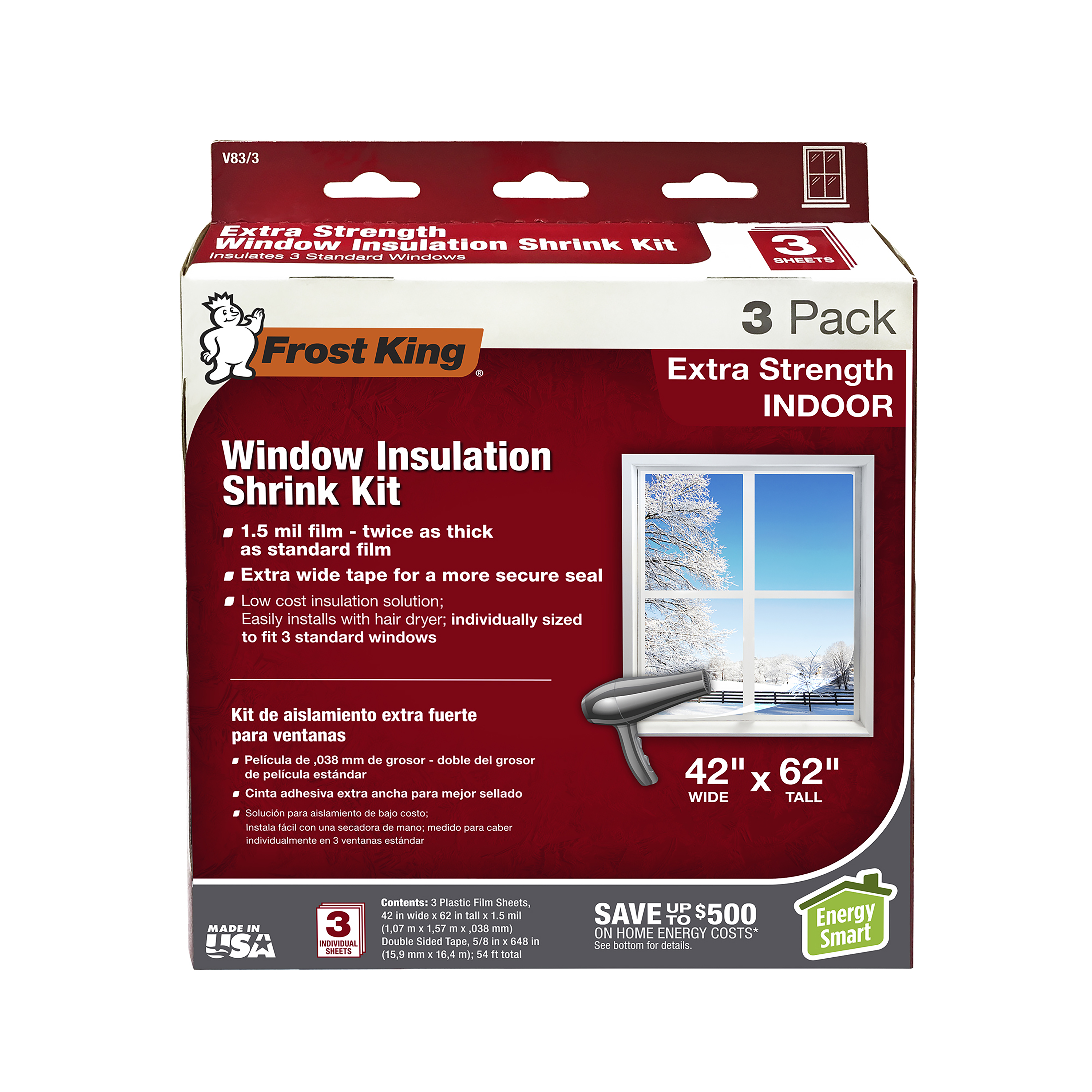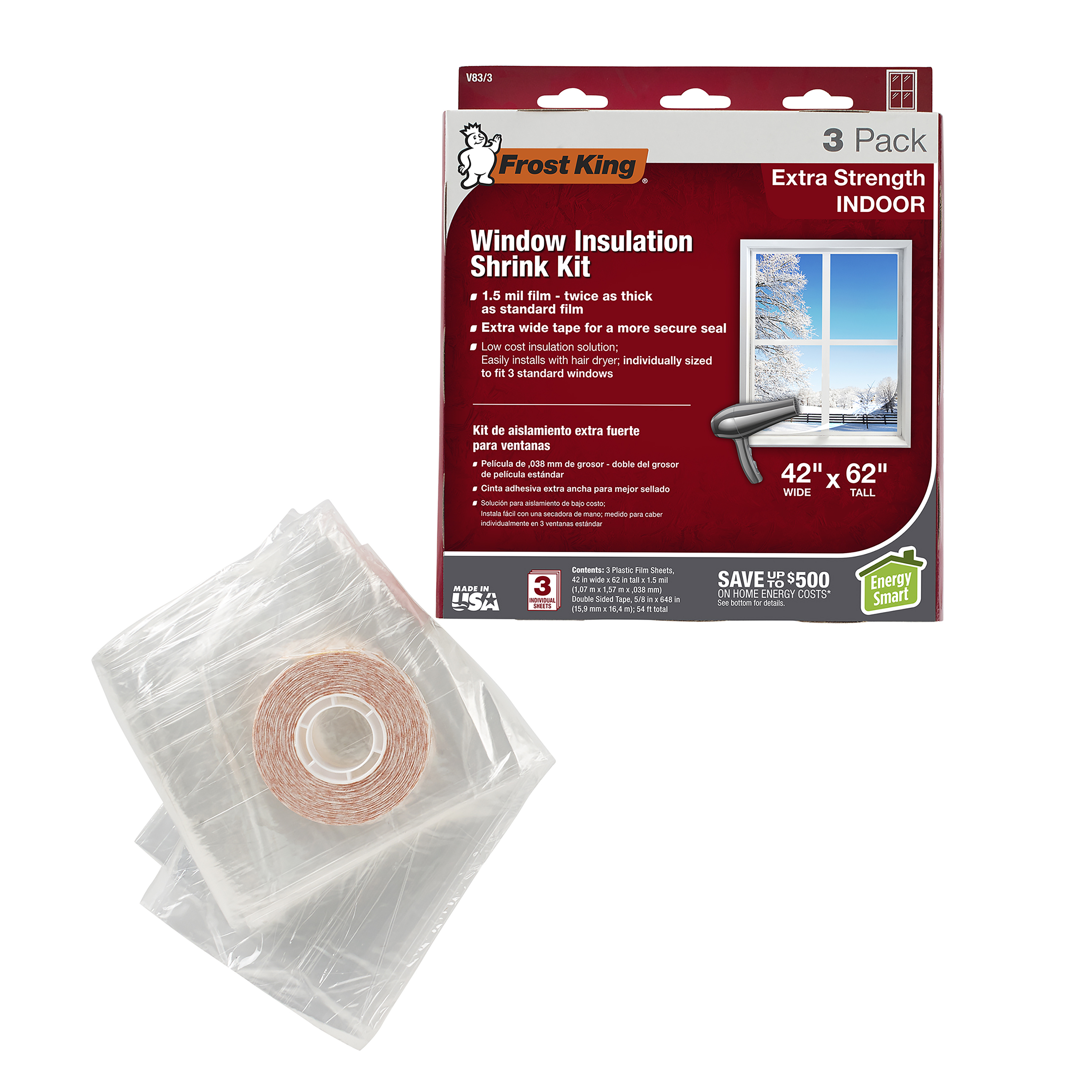 Frost King Indoor Heavy Duty Film Window Insulation Kit; Size - 42 x 62 in.. This extra thick 1.5 ml.. polyfilm is puncture resistant and twice as strong as most other insulation films. This 3 pack also includes extra wide tape for a more secure seal. Fits 3 Standard Windows. Increases R-Value Up To 90 percent. Dimension - 1.5 x 8 x 7.5 in.. Item Weight - 0.82 lbs.Specifications