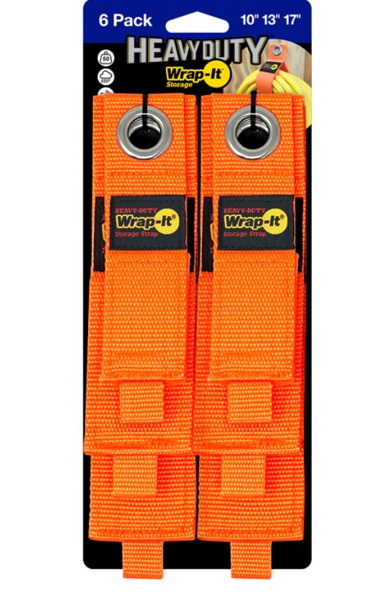 Heavy-Duty Wrap-It Storage Straps are tough. Made with heavy-duty polypropylene, industrial strength hook and loop, and a rust-resistant grommet these are built to last indoors or outdoors. Organize, hang, and store cords, hoses, rope, and so much more! Great to get organized around the house or in the garage, shop, shed, RV, boat, or truck.Specifications