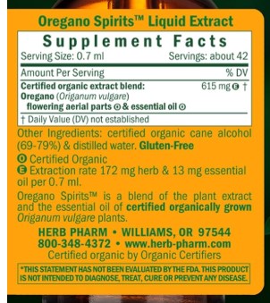 Our Oregano Spirits is a proprietary blend of extract and essential oil of Origanum vulgare plants. The liquid extract is prepared from the flowering herb of Certified Organic plants, while the essential oil is made from Certified Organic plants and/or plants Responsibly Wildcrafted from their native habitats. The flowering herb of the plant is harvested in summer and is then carefully shade-dried for the extract. The essential oil is steam-distilled (solvents are never used). Oregano Spirits liquid extract supports the immune system. The flavor profile is intensely fiery and pungent, spicy and highly aromatic (be sure to dilute before use). Seek expert medical advice before taking during pregnancy or nursing. These statements have not been evaluated by the FDA. These products are not intended to diagnose, treat, cure, or prevent any disease.Expertly extracted as an active responder for immune system support.Proprietary blend of the liquid extract and essential oil of Origanum vulgare plants.Rapidly absorbed liquid extract. Gluten-free, Vegan and non-GMO.The herb is extracted in small batches with Certified Organic cane alcohol to maintain the balance of phytochemicals as they exist in the plant.We assure herb identity via macroscopic and organoleptic analysis, then confirm it through methods such as HPTLC fingerprinting specific to each herb.Specifications