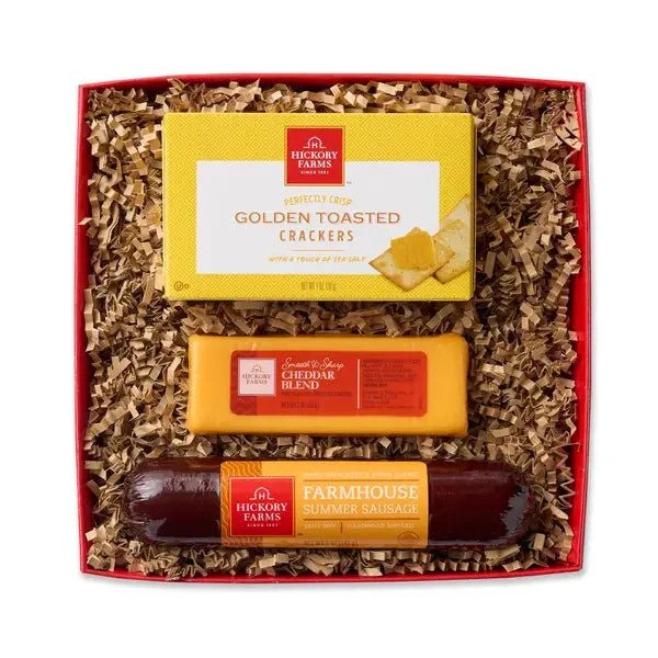 GIVE THE GIFT OF ORIGINAL HICKORY FARMS FLAVORS WITH THIS ORIGINAL HICKORY SAMPLER GIFT BOX THAT INCLUDES A FARMHOUSE SUMMER SAUSAGE GOLDEN TOASTED CRACKERS AND A SHARP CHEDDAR CHEESE BLEND.Specifications
