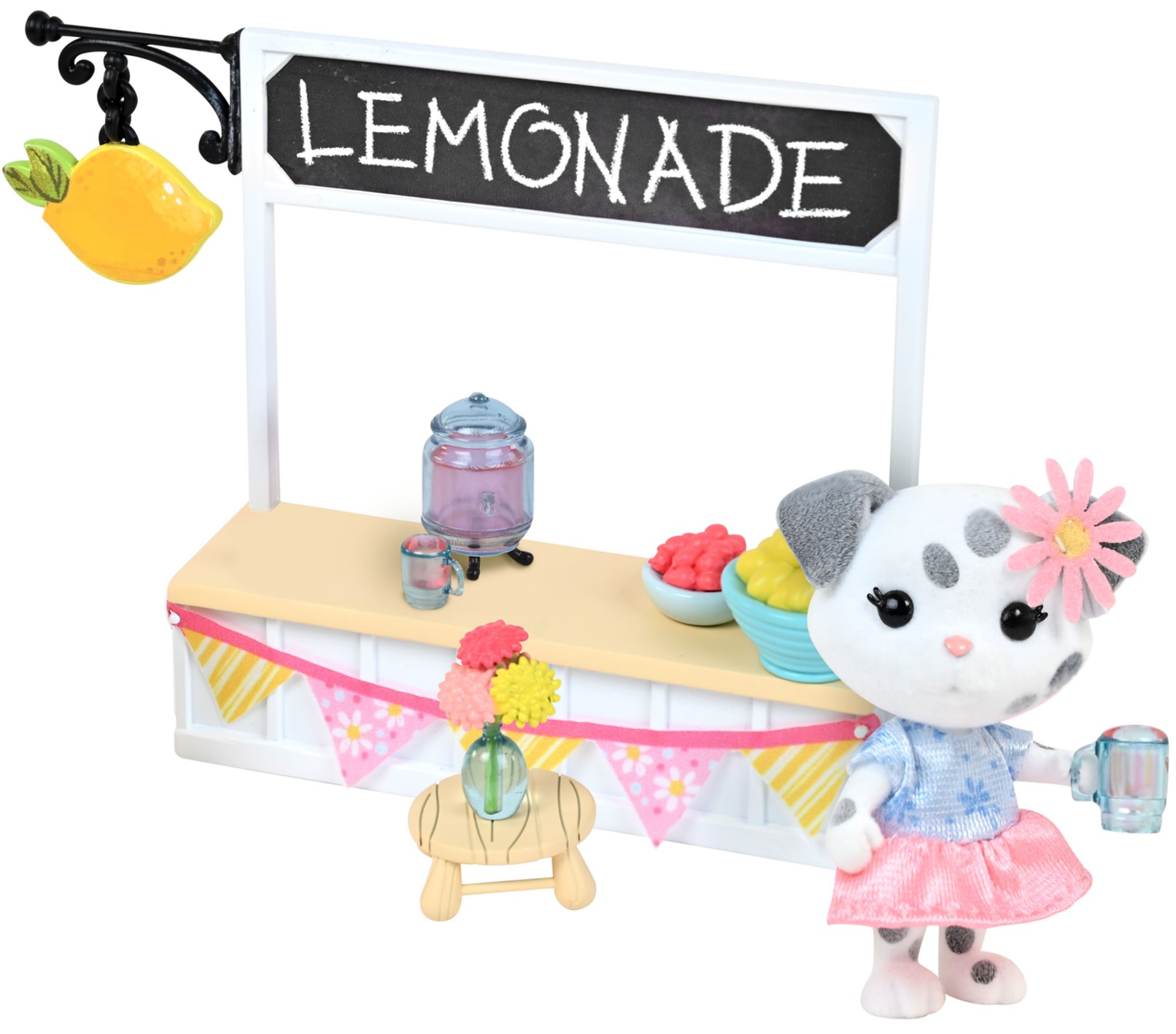 2.25 inch miniature flocked figure has poseable head, arms, and legs; The toy set includes 9 pieces, with lemonade stand, bowls of fruit, lemonade dispenser & cups, and exclusive dog figure.