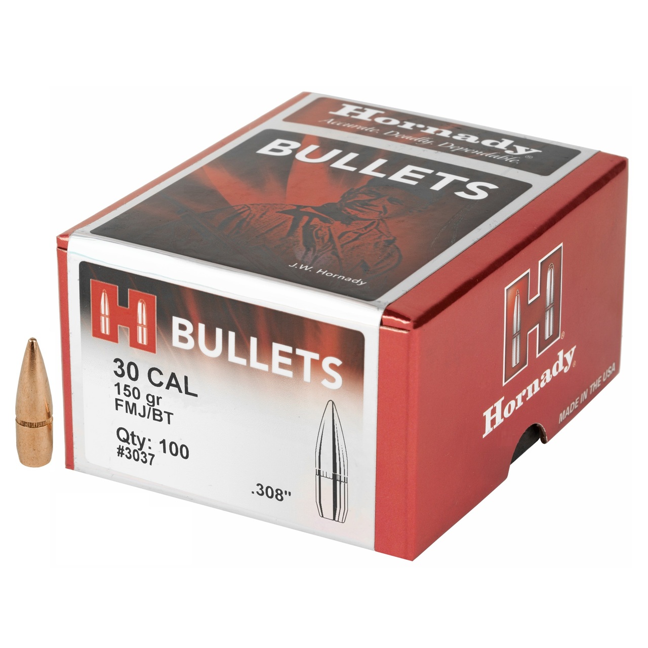 HORNADY 3037 TRADITIONAL RIFLE 30 CALIBER 308 150 GR FULL METAL JACKET BOAT TA BULLET TYPE