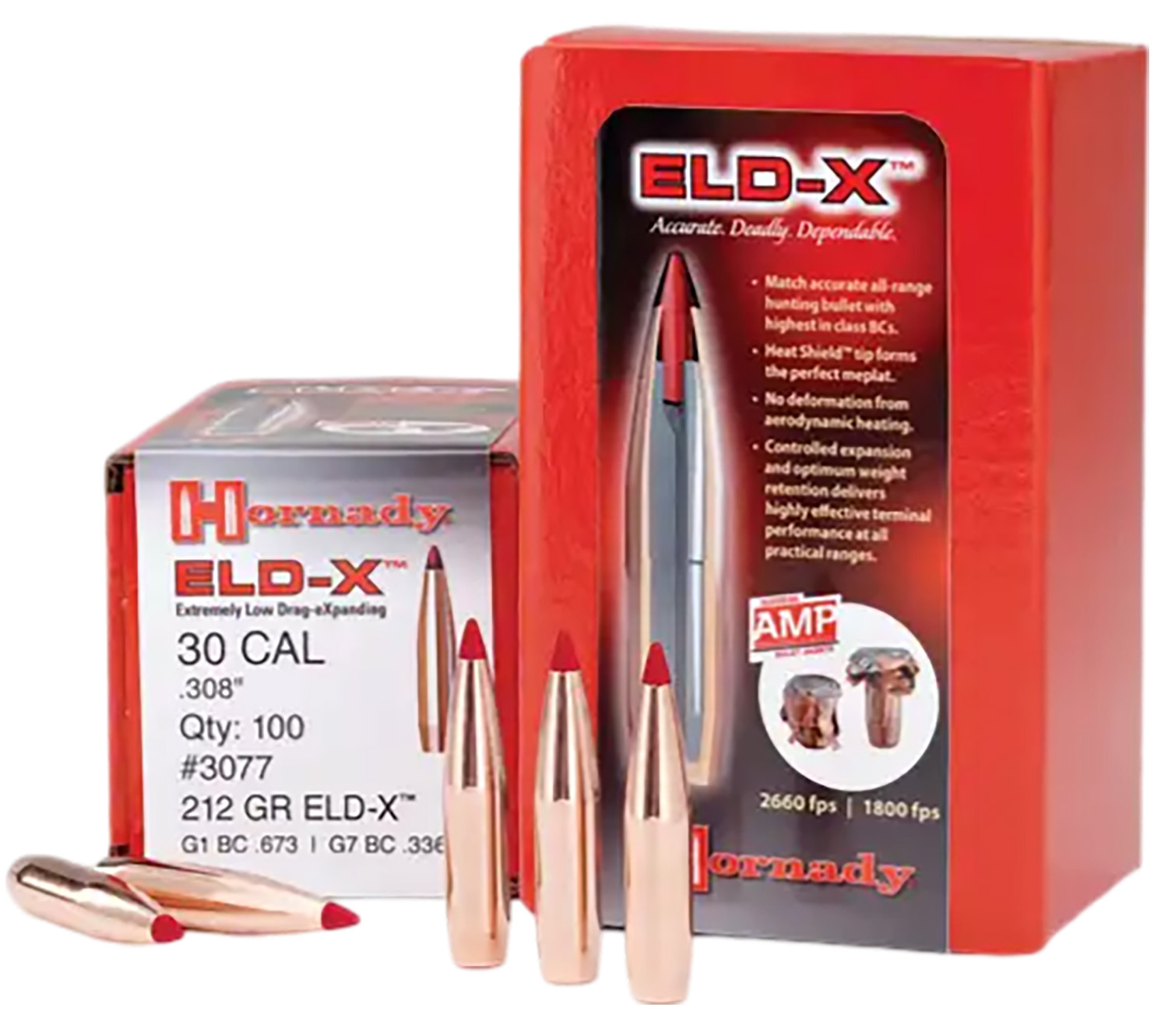 Hornady's ELD-X bullet is a technologically advanced, match accurate, all range hunting bullet. It features highest in class ballistic coefficients and consistent, controlled expansion at all practical hunting distances. Its Heat Shield tip is immune to the effects of aerodynamic heating and retains its shape to maintain the highest-in-class BC over its entire trajectory. It utilizes a streamlined secant ogive with optimum boattail design and highly concentric AMP bullet jackets. The thick shank of the jacket and high InterLock ring keep the core and jacket together providing 50-60% weight retention.Specifications