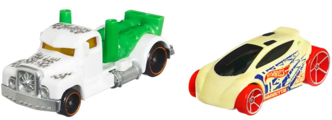 (WE CANNOT GUARANTEE SPECIFIC STYLES) The Hot Wheels Color Reveal 2 Pack of vehicles is loaded with awesome surprises! Inside the barrel drum are two 1:64 scale Hot Wheels Color Reveal cars covered in special Color Reveal coating. For the initial reveal, fill the drum with water and swirl each car around in it until the water changes color, the pull the car out -- the sweet decos hiding underneath are exposed! Want to change its appearance again? Fill the drum with cold water and dunk each car in for yet another awesome transformation! Change it back by dunking it in warm water! Repeat this over and over again alternating between warm or cold water. It's like having two cars in one! The barrel drum serves as a Hot Wheels dunk tank, and it's also perfect for storage! Each two-pack is sold separately, subject to availability. Colors and decorations may vary.Specifications