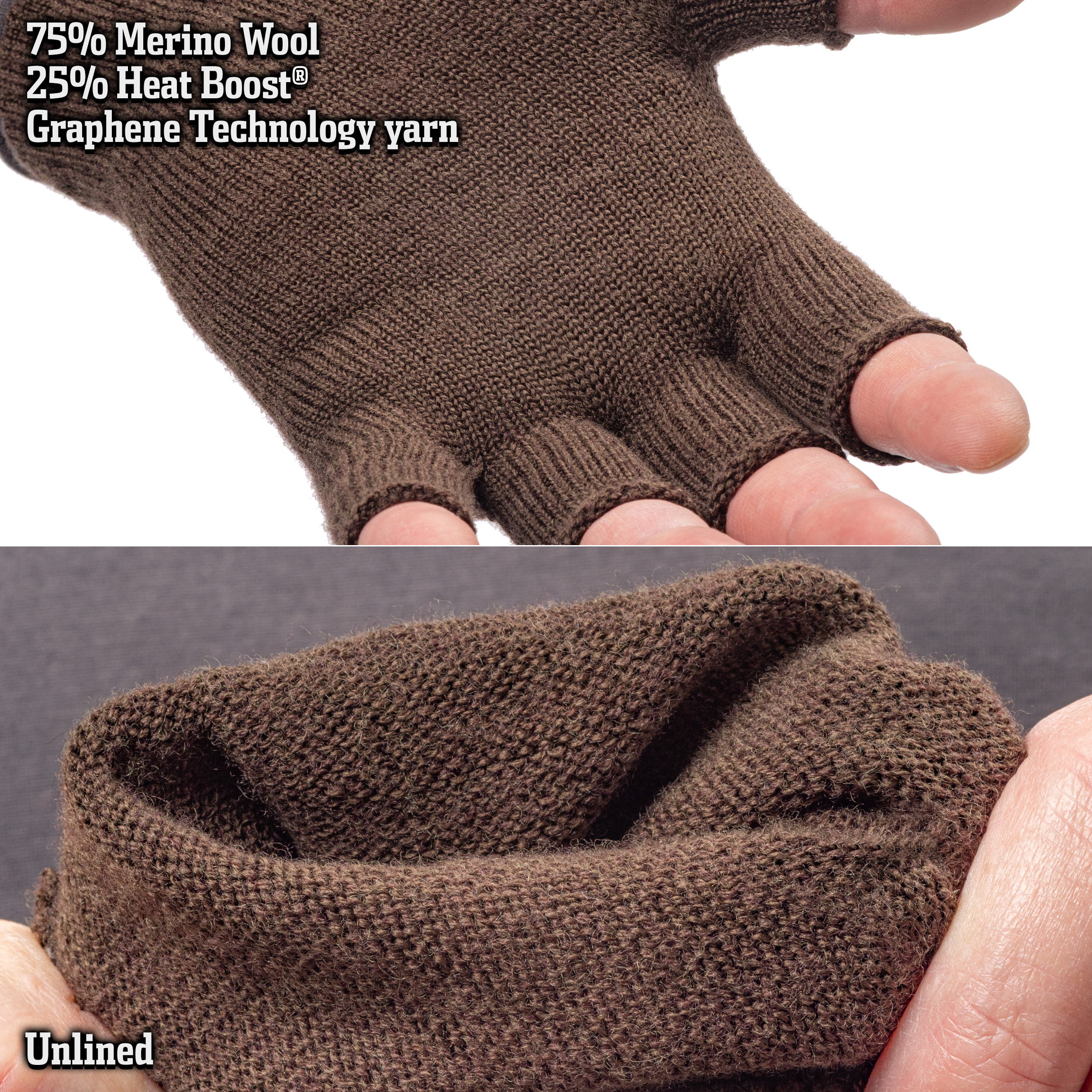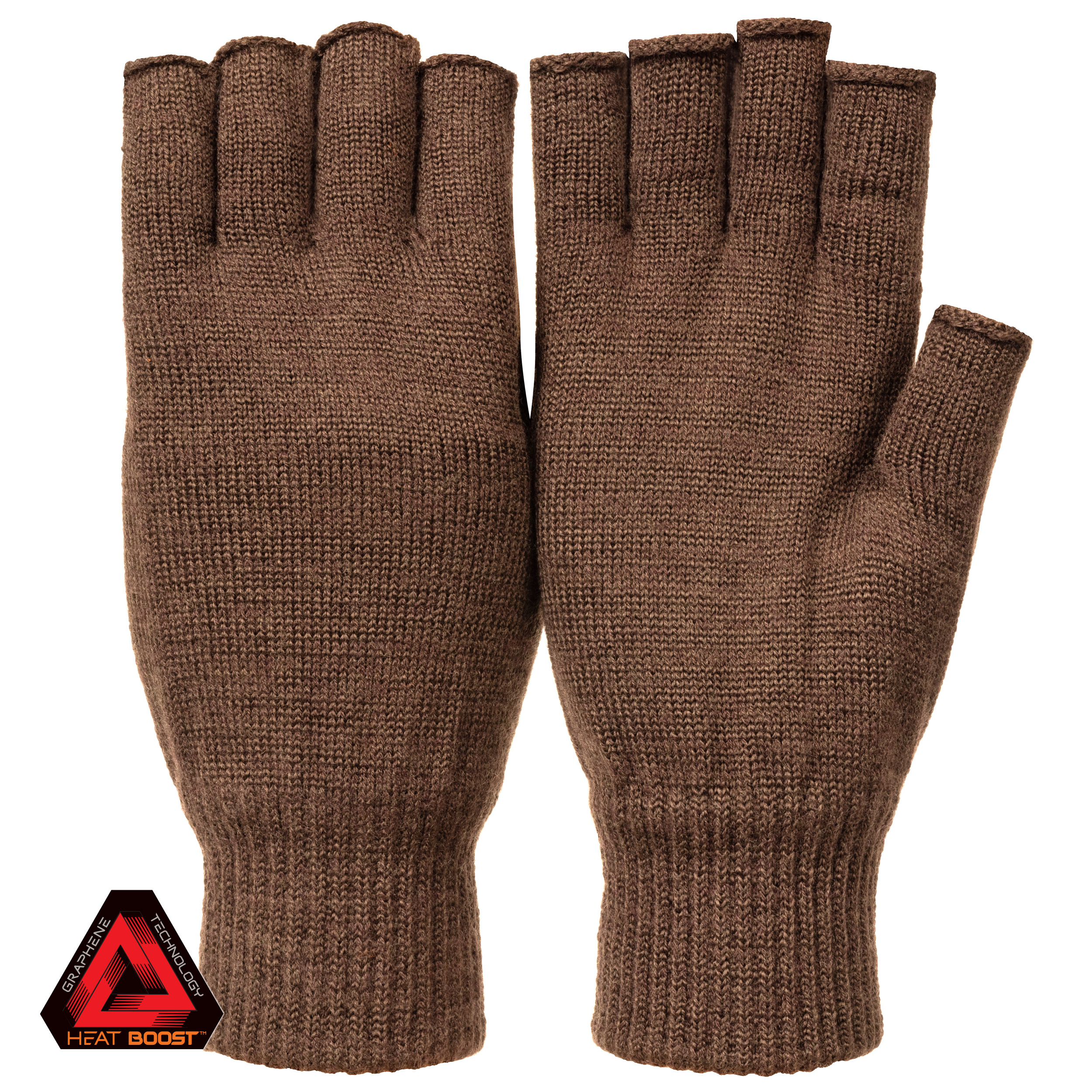 NO NEED TO CUT OFF THE FINGERS TO FEEL YOUR BOW OR TRIGGER. THESE HALF-FINGER GLOVES ARE MERINO WOOL INFUSED WITH HEAT BOOST GRAPHENE TECHNOLOGY YARN FOR WARMTH AND VERSATILITY. WITH THE NATURAL ANTI-ODOR AND WICKING FEATURES INHERENT TO MERINO WOOL AND GRAPHENE, THESE GLOVES ARE MADE TO KEEP YOU COMFORTABLE. USE FOR HUNTING OR ANYTIME IN THE ASH BROWN COLOR.Specifications