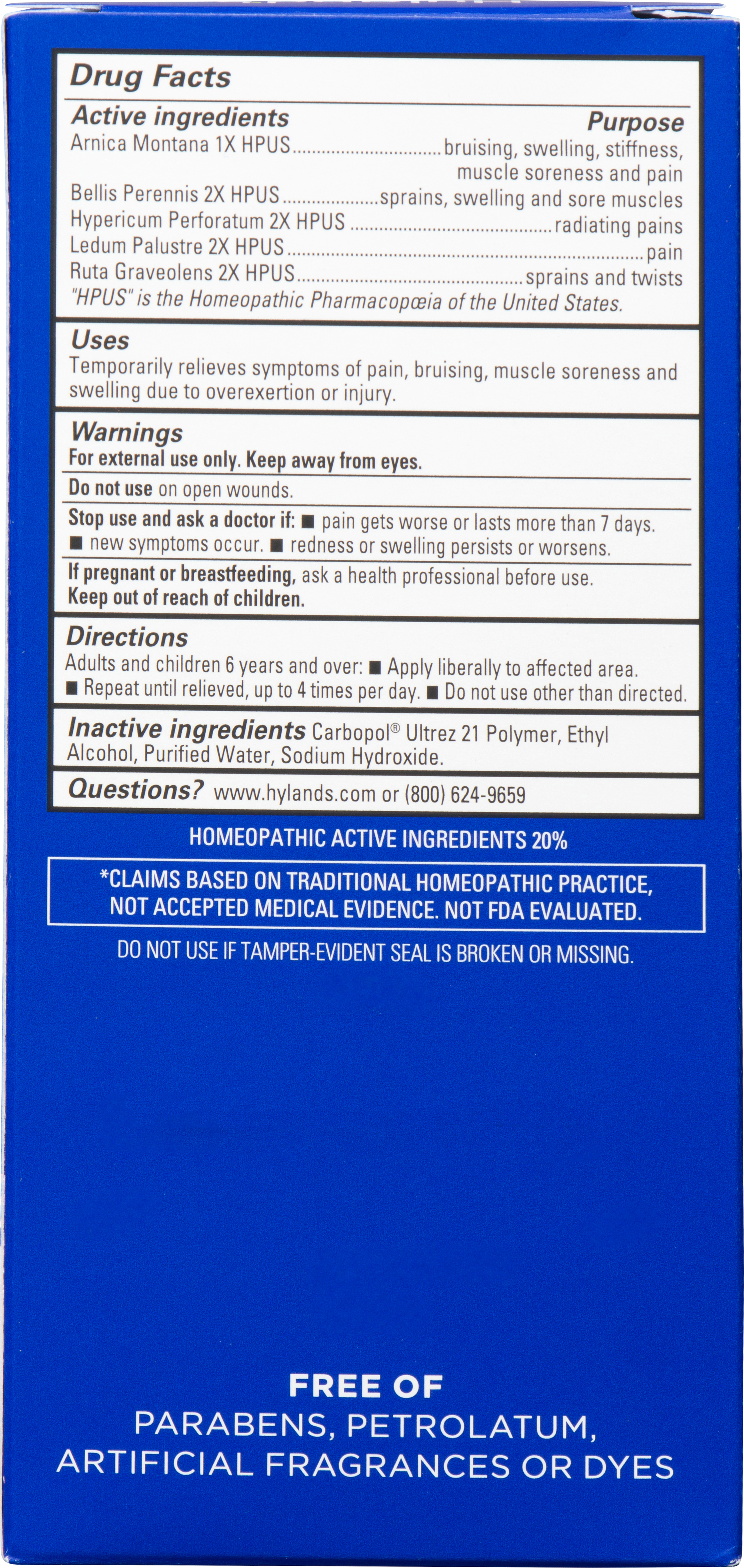 Hyland's Muscle Therapy Gel with Arnica provides topical relief of muscle soreness, bruising and minor swelling due to overexertion or injury. It contains Arnica - the first natural remedy for minor swelling and bruising. Provides natural, safe and pain relief, absorbs quickly, is never greasy and has a light, pleasant smell.Specifications