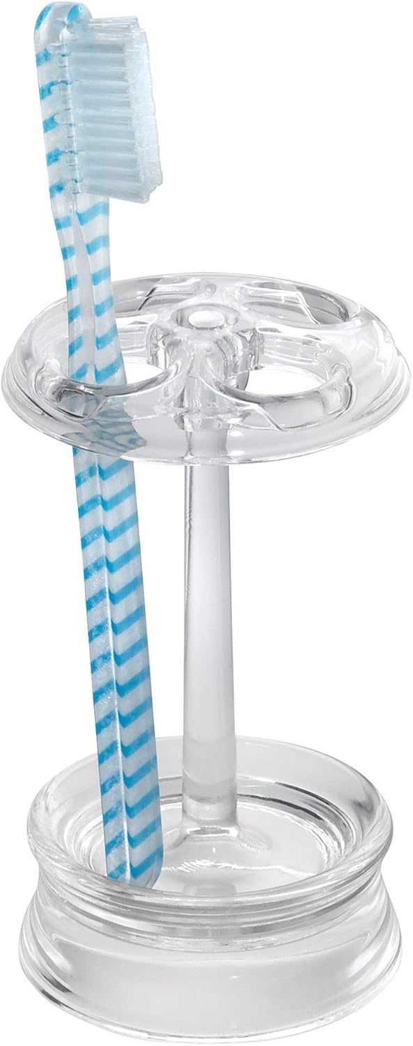 Clear finish provides a beautiful and classic style to match any decor; Features 4 slots for multiple toothbrushes to accommodate for the whole family; Freestanding plastic toothbrush holder perfect for use in master bathrooms, guest bathrooms, college dorm rooms, and kid's bathrooms. Holder is easy to clean for your convenience; Made of durable plastic to provide years of quality use
