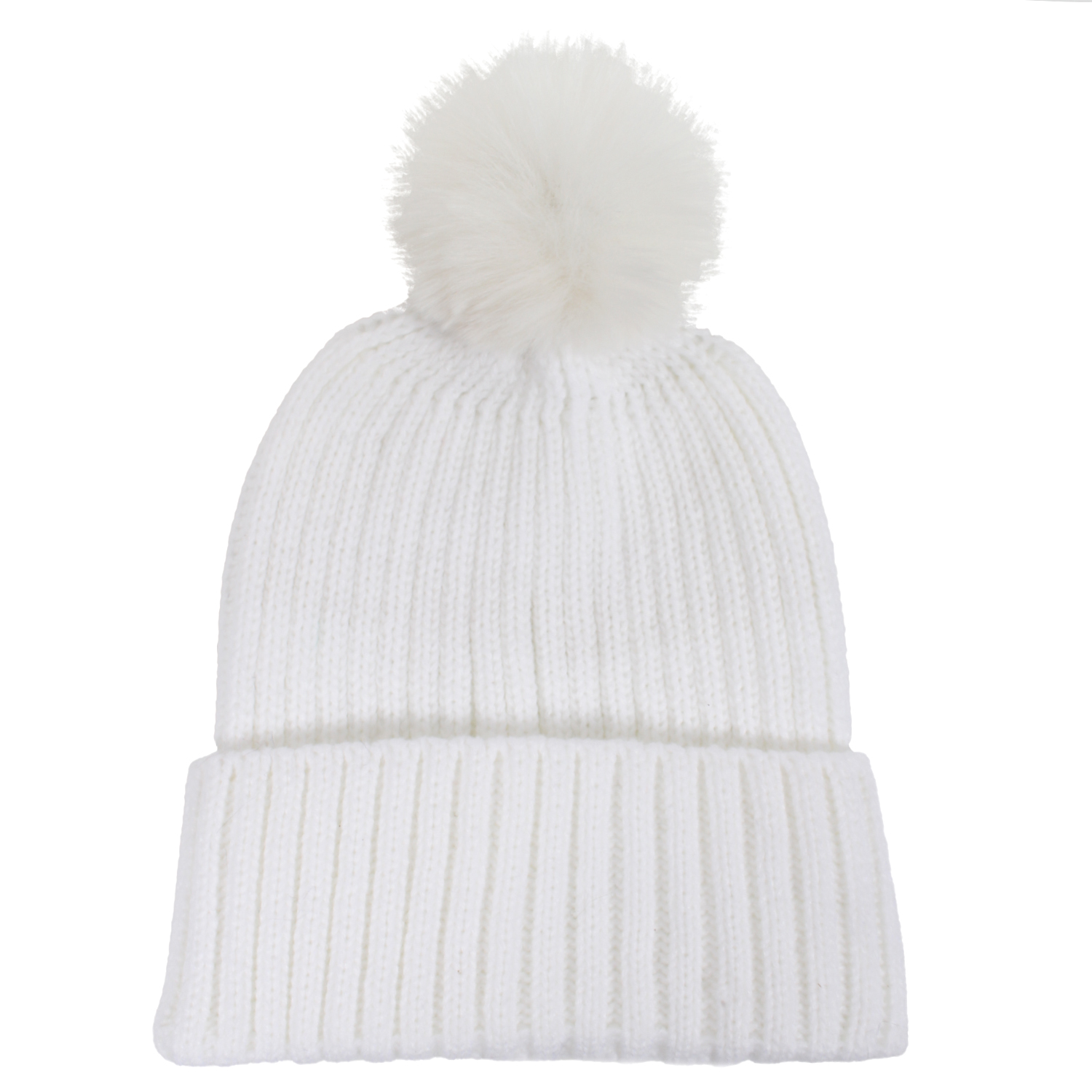 100% ACRYLIC; FAUX RABBIT FUR POM; RIBBED KNIT; SINGLE LAYER