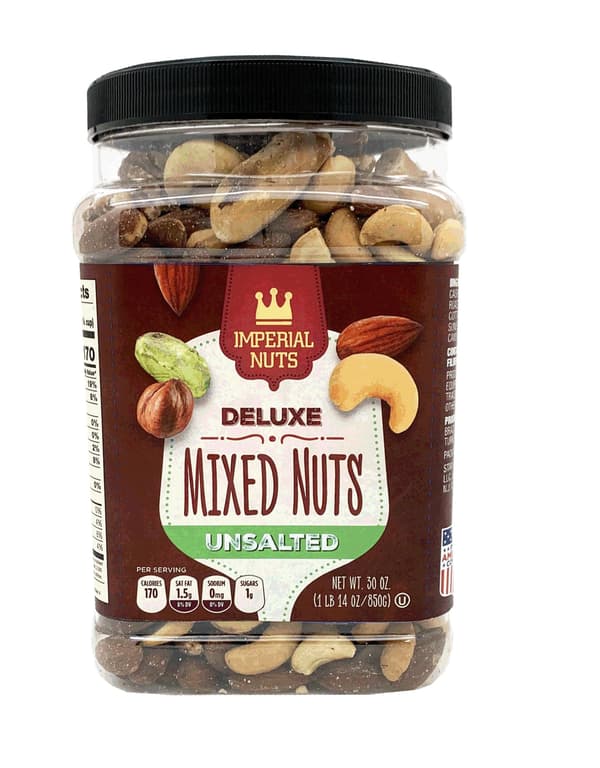 For your next snack attack, reach for this canister of un-salted deluxe mixed nuts from Imperial Nuts. Offering a variety of nuts, including almonds, cashews, filberts and pistachios, there's something for everyone in this container.Specifications