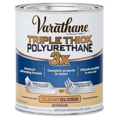 Varathane Triple Thick Polyurethane is 3X thicker than a traditional polyurethane. It is an advanced self leveling formula that allows projects to be completed in one coat while offering excellent scratch and stain resistance. It also provides fast dry times as well as the convenience of soap and water clean-up. It is suitable for use on all interior wood surfaces including furniture, doors, trim and more.Specifications