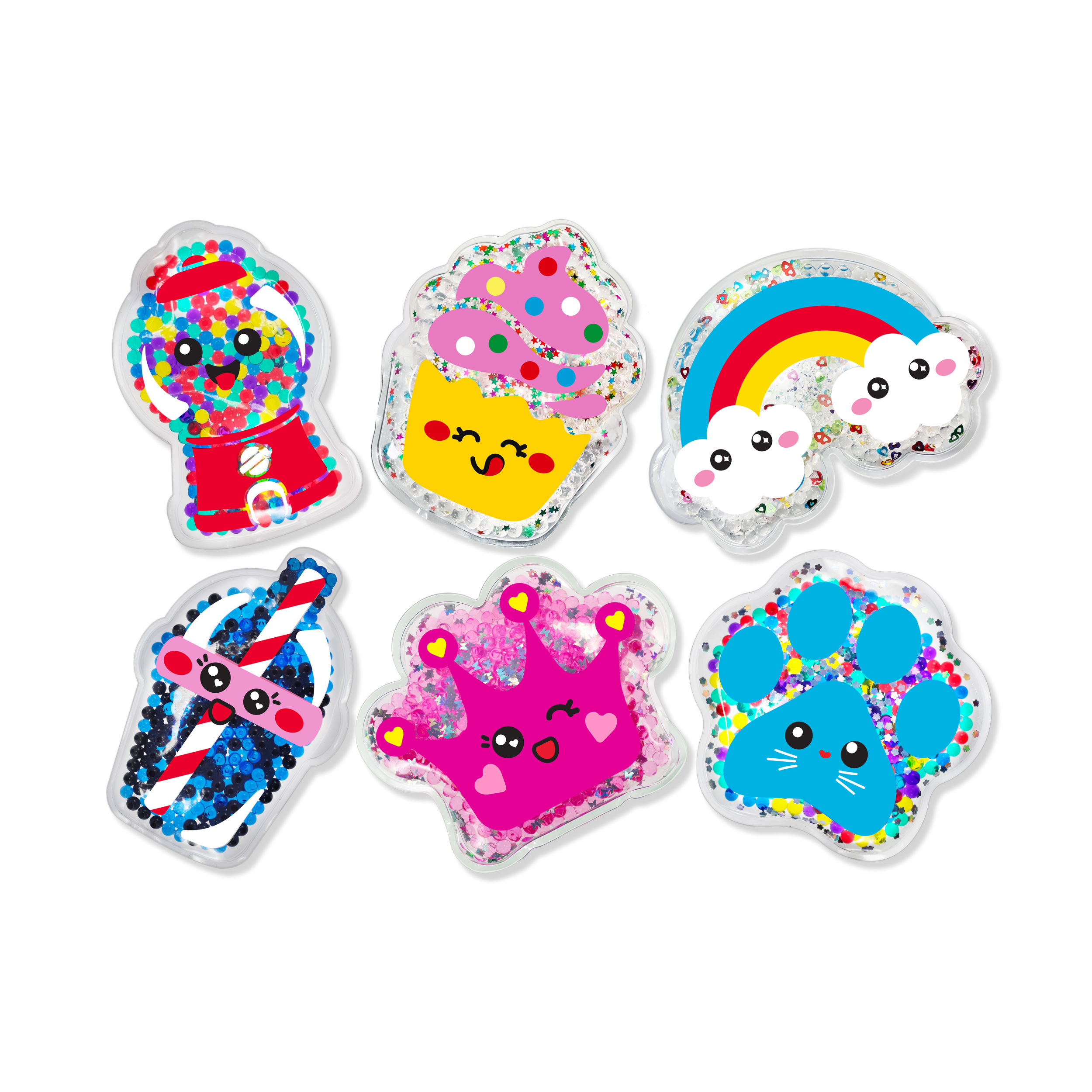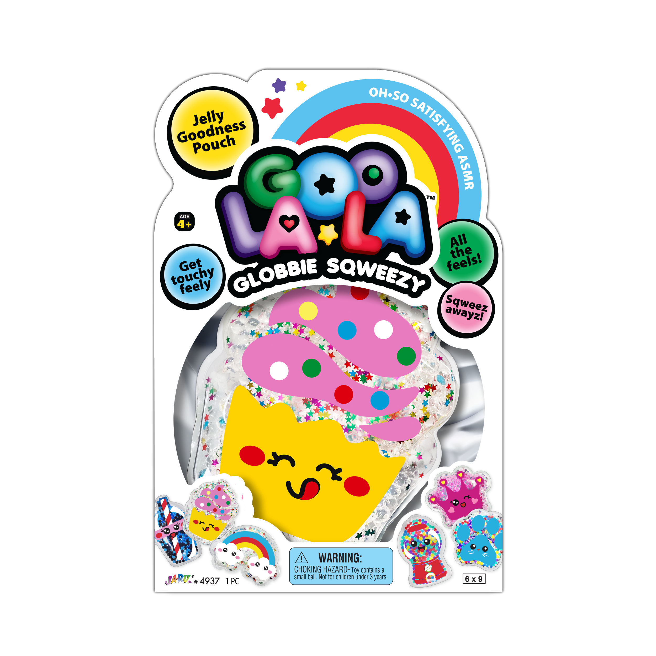 Get touchy feely and sqweez away!; GooLaLa Globbie Sqweezy comes in 6 jelly bead filled shape; Gumball Machine, Rainbow, Bobba Drink, Cat Paw, Crown, and Cupcake!