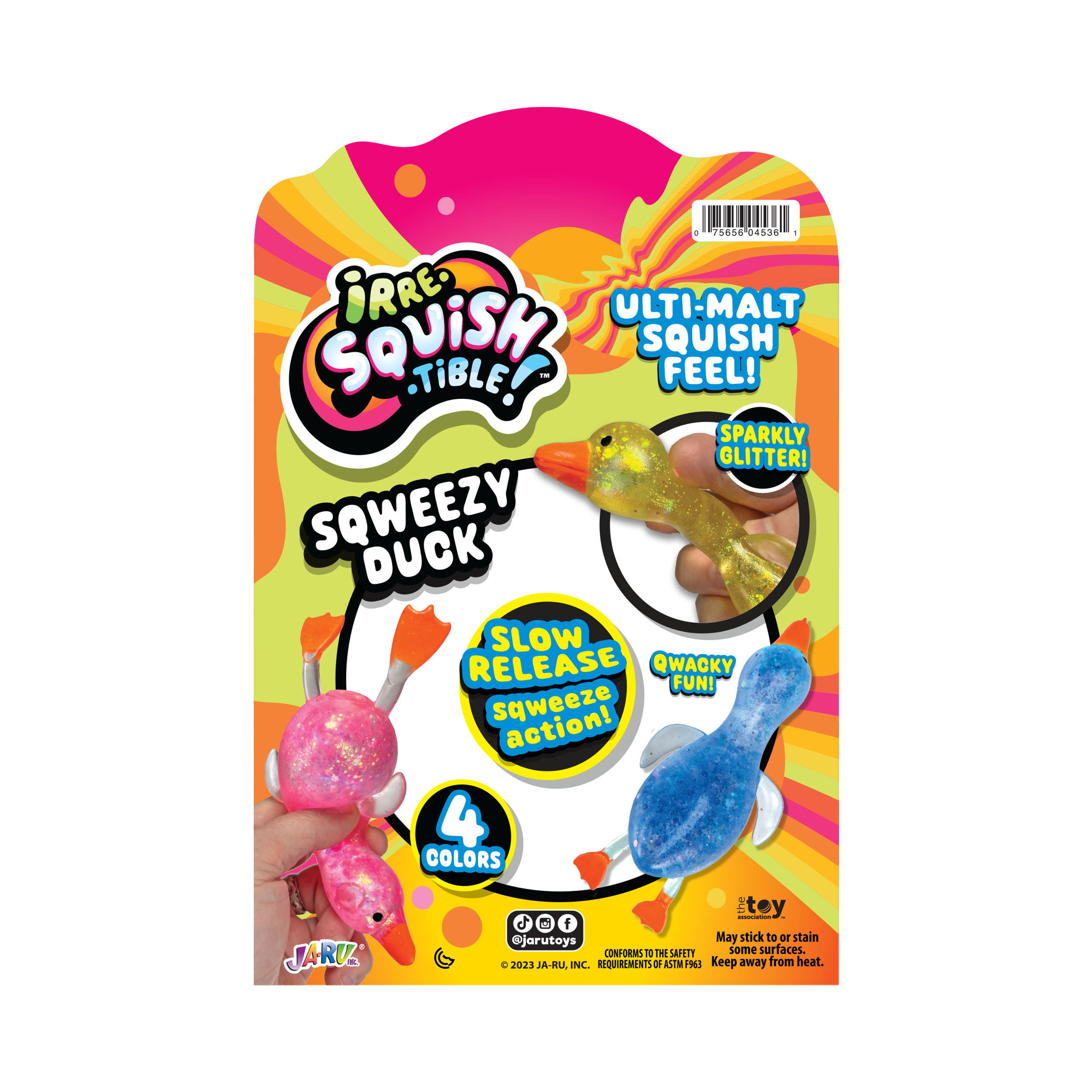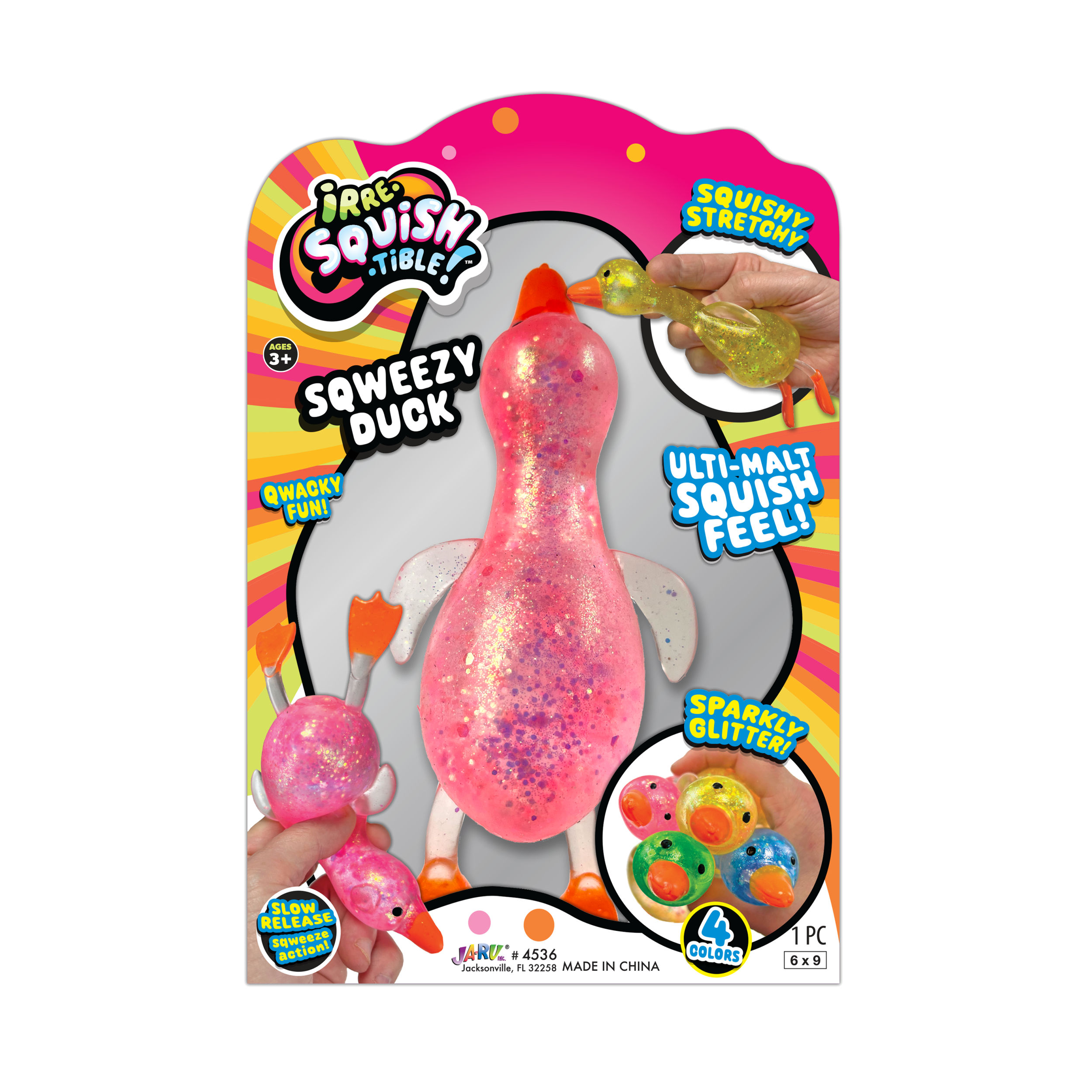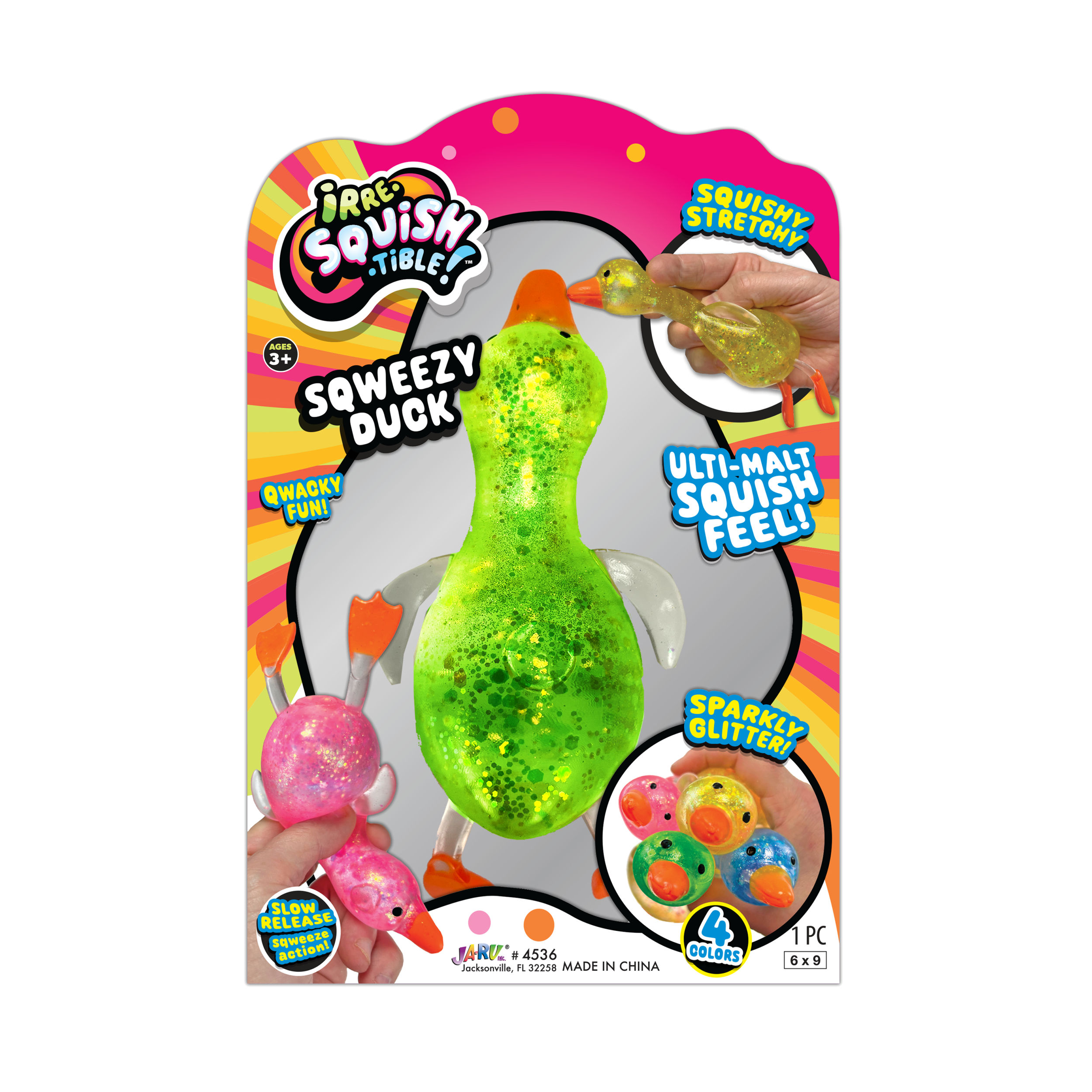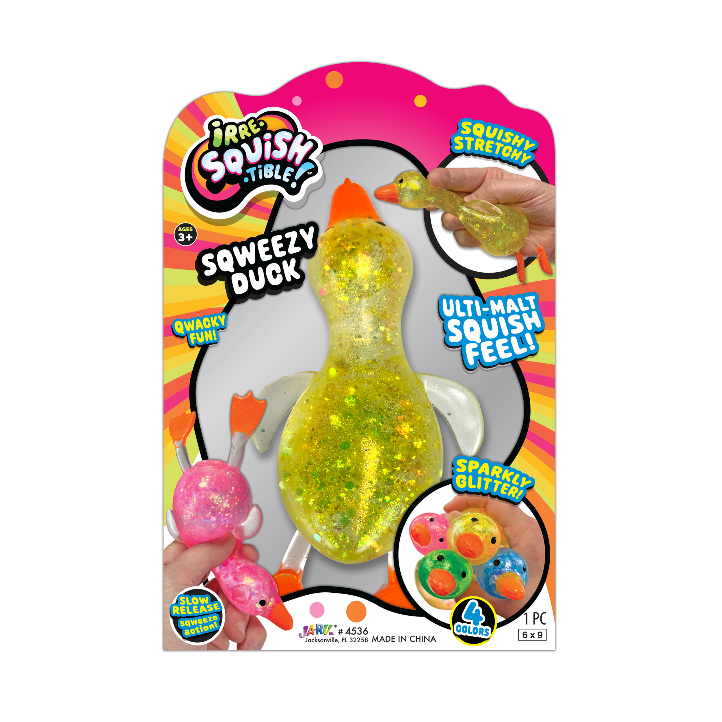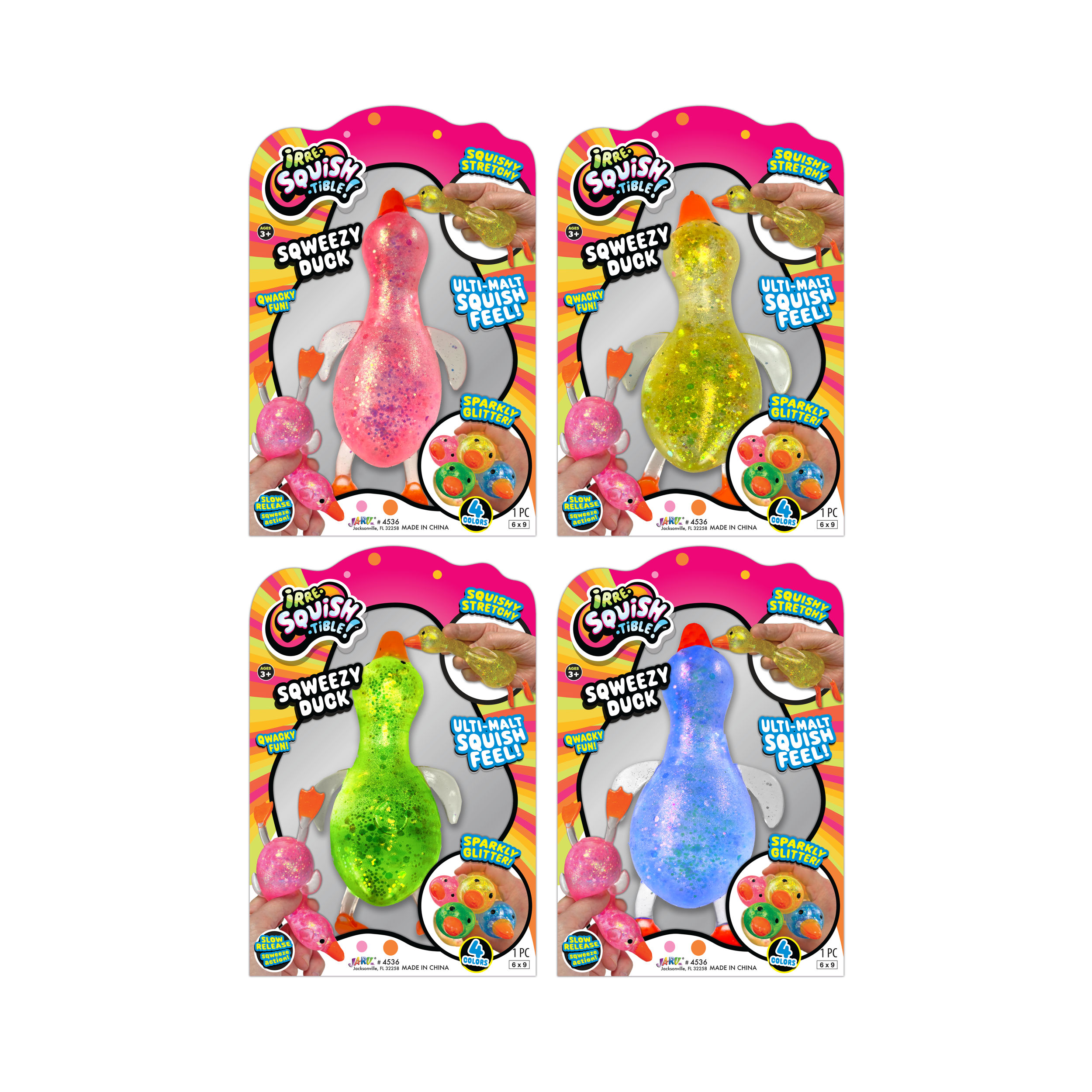 (We cannot guarantee a specific color) If you would like us to choose for oyu we are happy to do so. If not, please visit us in store to choose your favorite color.Step right into a world of squishy delight with JA-RU Squishy Glitter Ducks! These toy animal pack aren't your ordinary stress balls; they're adorable, glitter-filled companions designed to bring joy and relaxation to kids and adults alike. Crafted with care and bursting with personality, our Squishy Glitter Ducks are the ultimate fidget toy for restless hands. Squeeze, squish, and watch in amazement as the mesmerizing glitter swirls and sparkles inside their transparent rubber bodies. It's like holding a tiny galaxy of fun right in the palm of your hand!Specifications