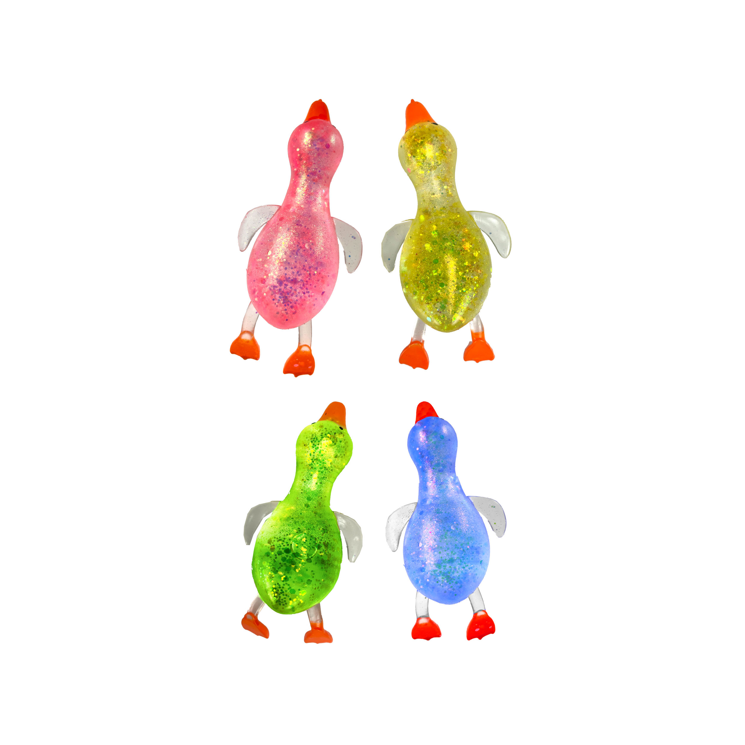 4 Assorted glitter color (Pink, Green, Blue, Yellow Duck). Filled with mesmerizing glitter that swirls and sparkles with every squeeze.; Each Jumbo Mochi Squishy Duck is made from squishy, stretchy and durable rubber materials. Easy to wash with soap and water.; Squeeze away stress and tension with our squishy duck stress ball. Fun anti stress toys to unwind after a long day.