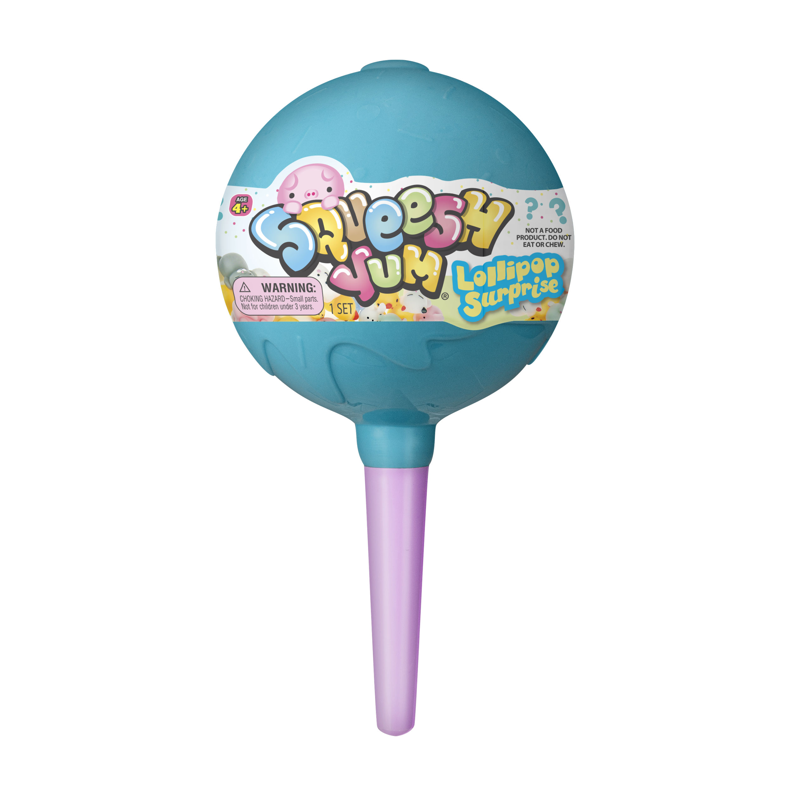 available in 4 colors; randomized gummy like jiggly friends inside a plastic lollipop,; Squeesh Yum Lollipop Surprise come with 5 surprise squeesh yums