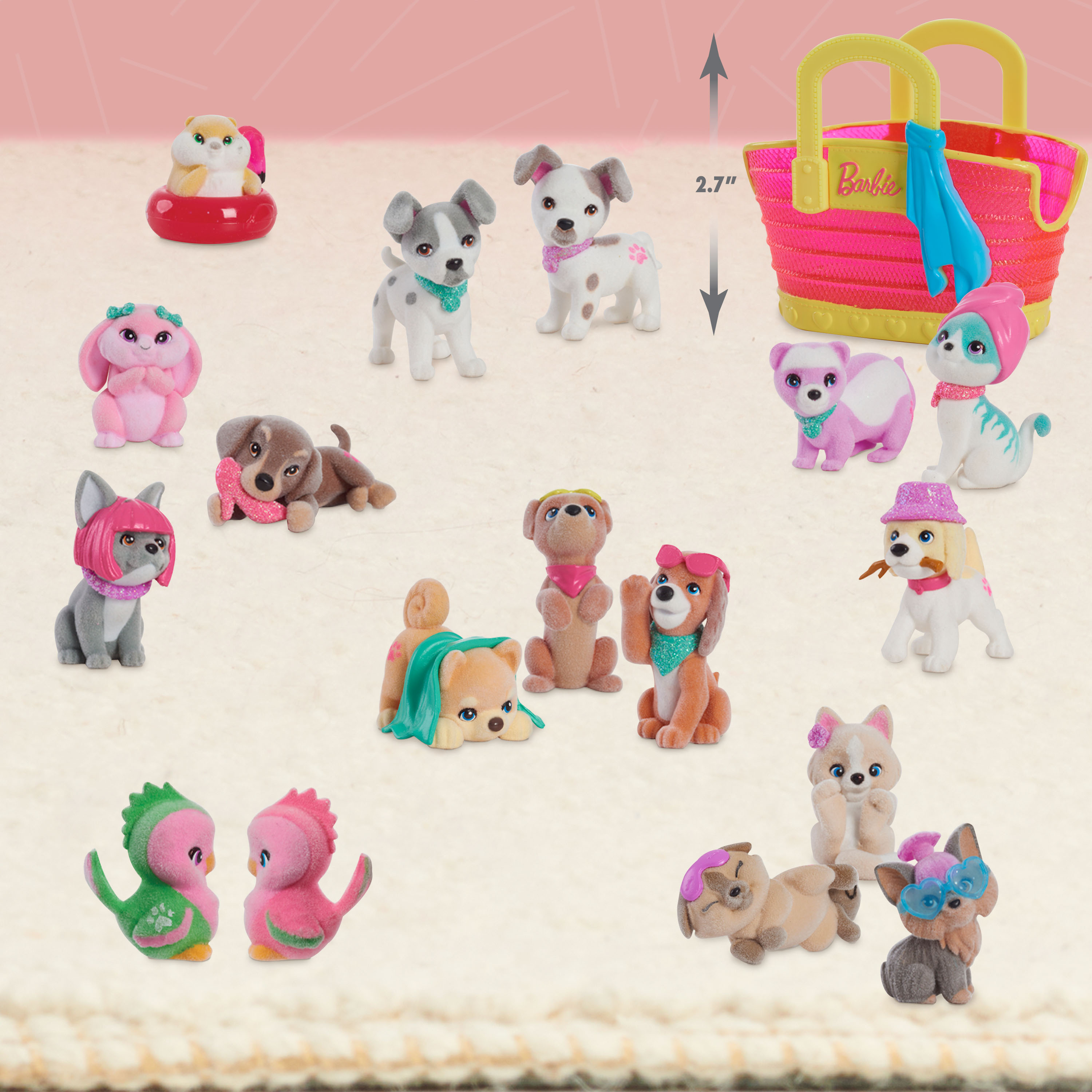 Double the fuzzy animal fun with Barbie Pets Mini Collectible Figures. Each stylish tote carrier contains not 1, but 2 surprise pet figurines hidden inside blind bags. Open it to discover the pets. This series contains a total of 18 figures, including a playful French bulldog wearing Barbie’s wig, a sweet purple ferret, adorable twin Pit Bull Terrier twins, a kitty with a towel on her head, twin parakeets, a hamster in a floatie, and more. Each fuzzy flocked animal friend stands approximately 1.5 inches tall and has a unique style and pose. Collect all 18 to display, share, or trade with friends. All figures are compatible with other Barbie Pets preschool kids’ toys, figures, and playsets. Barbie Pets make paw-fect kids gifts, stocking and Easter basket stuffers, and party favors for little animal lovers ages 3 years and up.Specifications