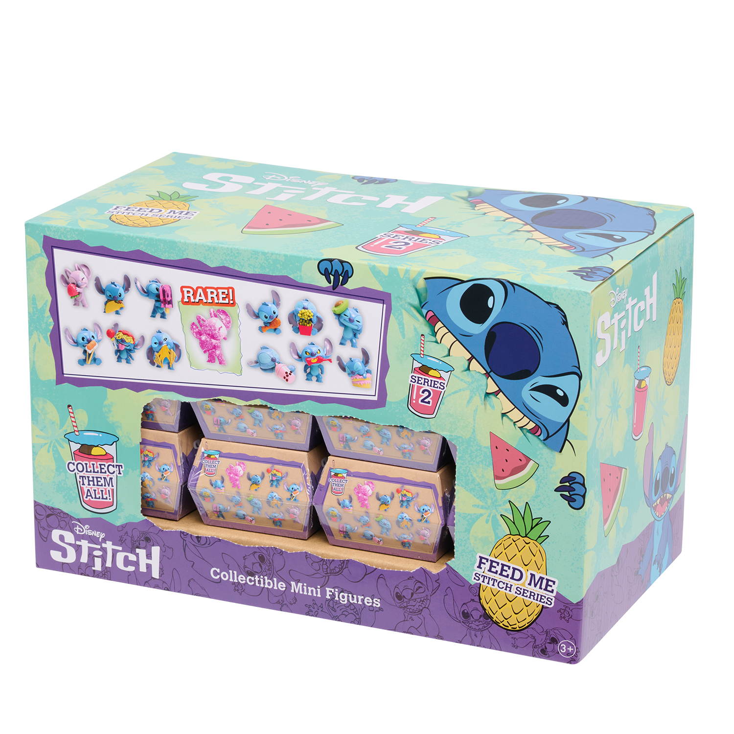 Stitch loves food! The Disney Stitch Feed Me Series Capsule Mini Figures feature Disney’s lovable blue alien depicted with one of his favorite foods. Which will it be? Kids and collectors will love opening these blind capsules to discover an adorable, brightly colored, kawaii-styled Stitch enthusiastically posed with one of 12 different surprise snacks everything from a bag of chips to a frosted donut, to a pineapple! Great for a Disney Lilo & Stitch-themed party, these mini figures are cute as cake toppers and party favors, too. Collect them all! Each sold separately. Ages 3+Specifications