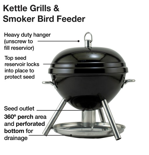 The Kettle Grill feeder is sure to attract many birds to your backyard, providing you with plenty of enjoyment as birds congregate on the circular perch. Boasting an innovative design, this feeder allows seed to evenly dispense into the seed tray and stops dispensing once the tray is full. As the birds continue to dine from the circular perch, the seed is replenished into the tray so it remains consistently full. Bird feeder offers a sizable 2.5 pound seed capacity so your hungry birds are always in good supply. Not only will the birds love it, it also means less seed waste for you! In addition, the large overhang shields the tray and birds as they dine.Specifications
