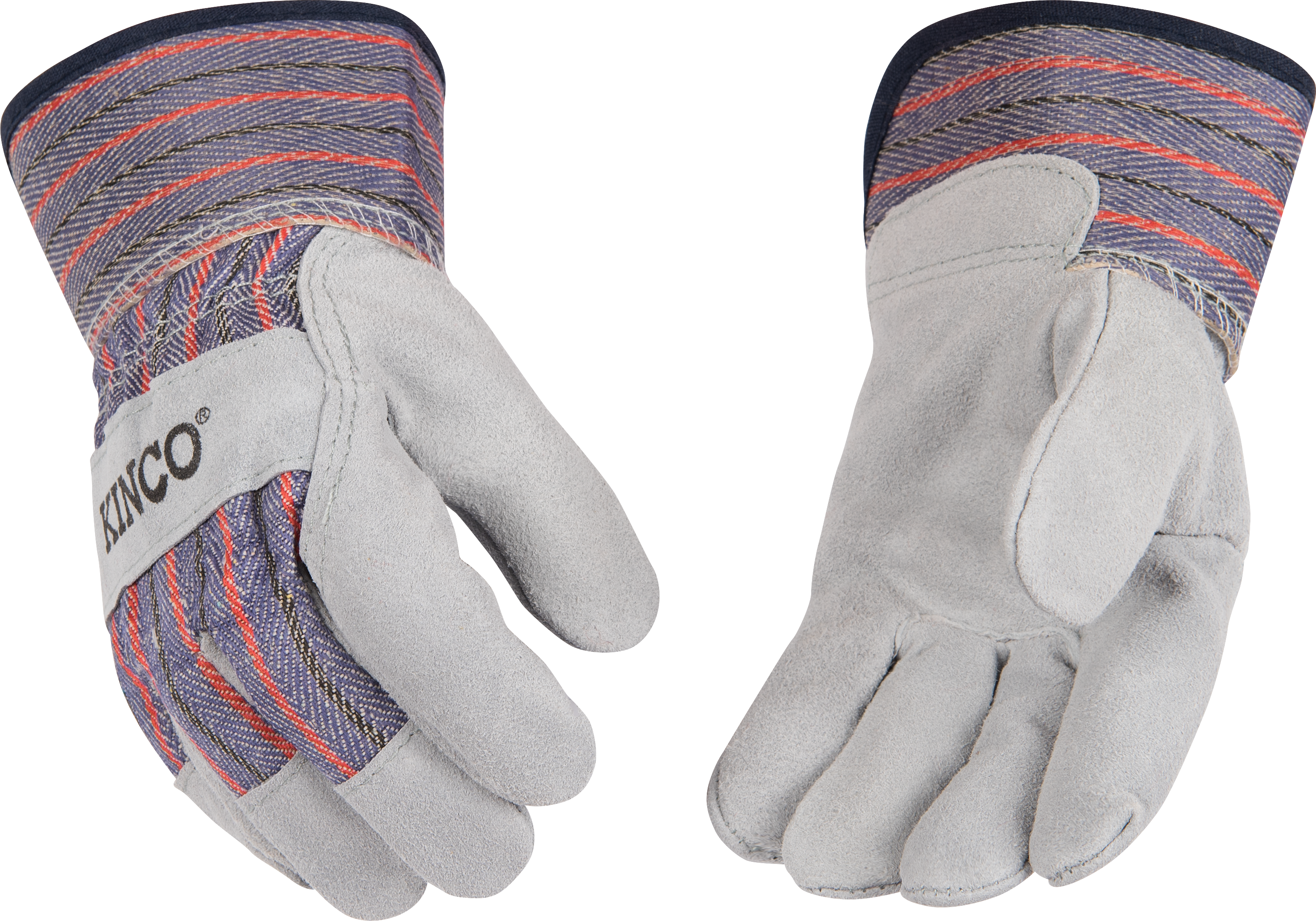 Cotton-blend canvas fabric starched safety cuff guards wrist from outside elements & helps to deflect debris when layered over long sleeves; Gray suede leather palm provides good durability from wear & tear while shielding the hand from punctures & abrasions.; Striped cotton-blend canvas fabric on back-of-hand offers lightweight breathable coverage