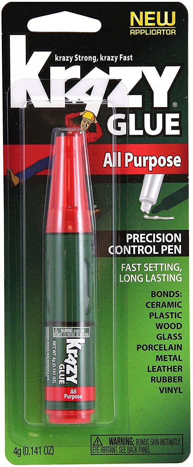For insanely accurate, absurdly permanent household repairs, depend on Krazy Glue All Purpose Precision Control Pen. Featuring a versatile, super-strong formula that bonds to a wide variety of materials including ceramic, plastic, wood, porcelain, metal, leather, and rubber, it’s a great all-purpose glue. The improved glue pen design features pressure grips that control glue flow, which means even less of it getting on your hands. Plus, the precision applicator delivers one drip at a time for accurate fixes while the airtight, leak-proof cap prevents the super glue from drying out. And, with a glue indicator, you know how much glue is left in the pen. The #1 super glue, you can count on Krazy Glue for super strong, crazy fast fixes.Specifications