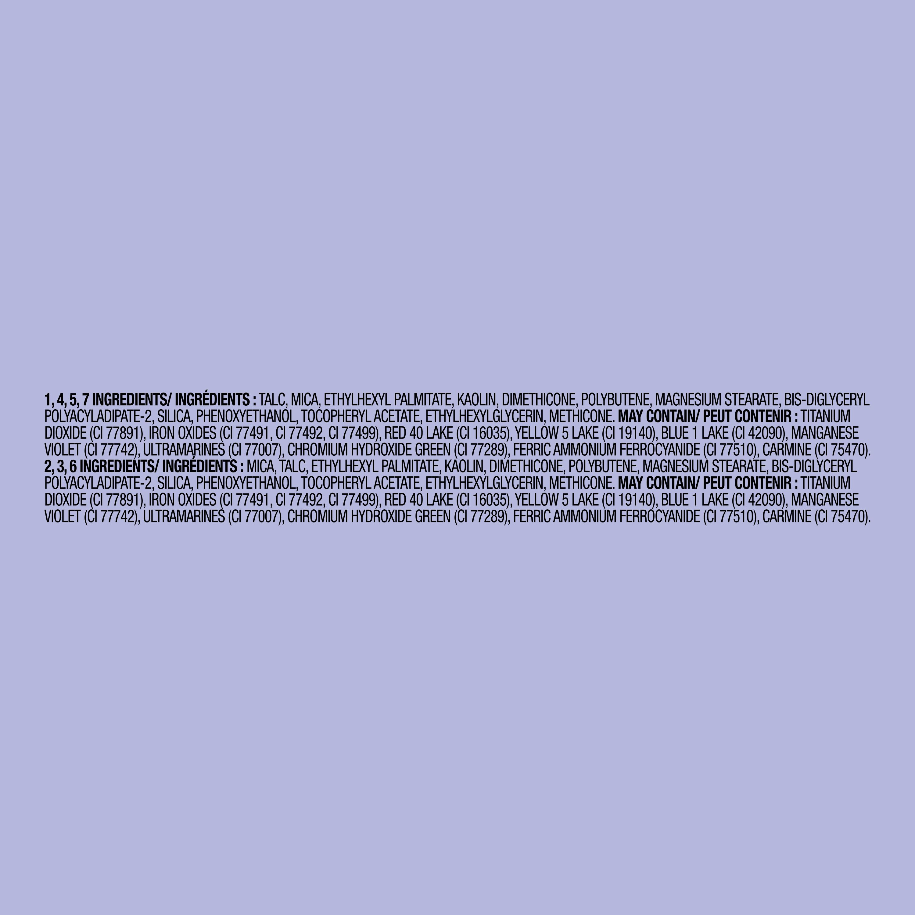 Add apop of colorto your makeup looks with a shadow thatleaves em' shook. Featuring shimmer, matte, and satin shades, indulge intotal coutureandallure. Available in 6 different cohesive palettes, each to match your mood. High color impact. Creamy soft powder. Blendable. Longwear.Specifications