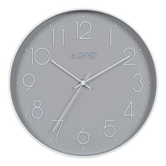 La Crosse Clock brings the style you love with the accuracy you need in the 12-inch Silent Sweeping Gray Quartz Analog Wall Clock. A distinctive gray face with embossed white modern sans serif numerals will beautifully accent your indoor spaces. Wrapped in a white plastic case and glass lens, this analog clock will look great long after you hang it. A quartz movement will keep its silent sweeping hands precisely accurate down to the second. Runs on a single AA alkaline battery.Specifications