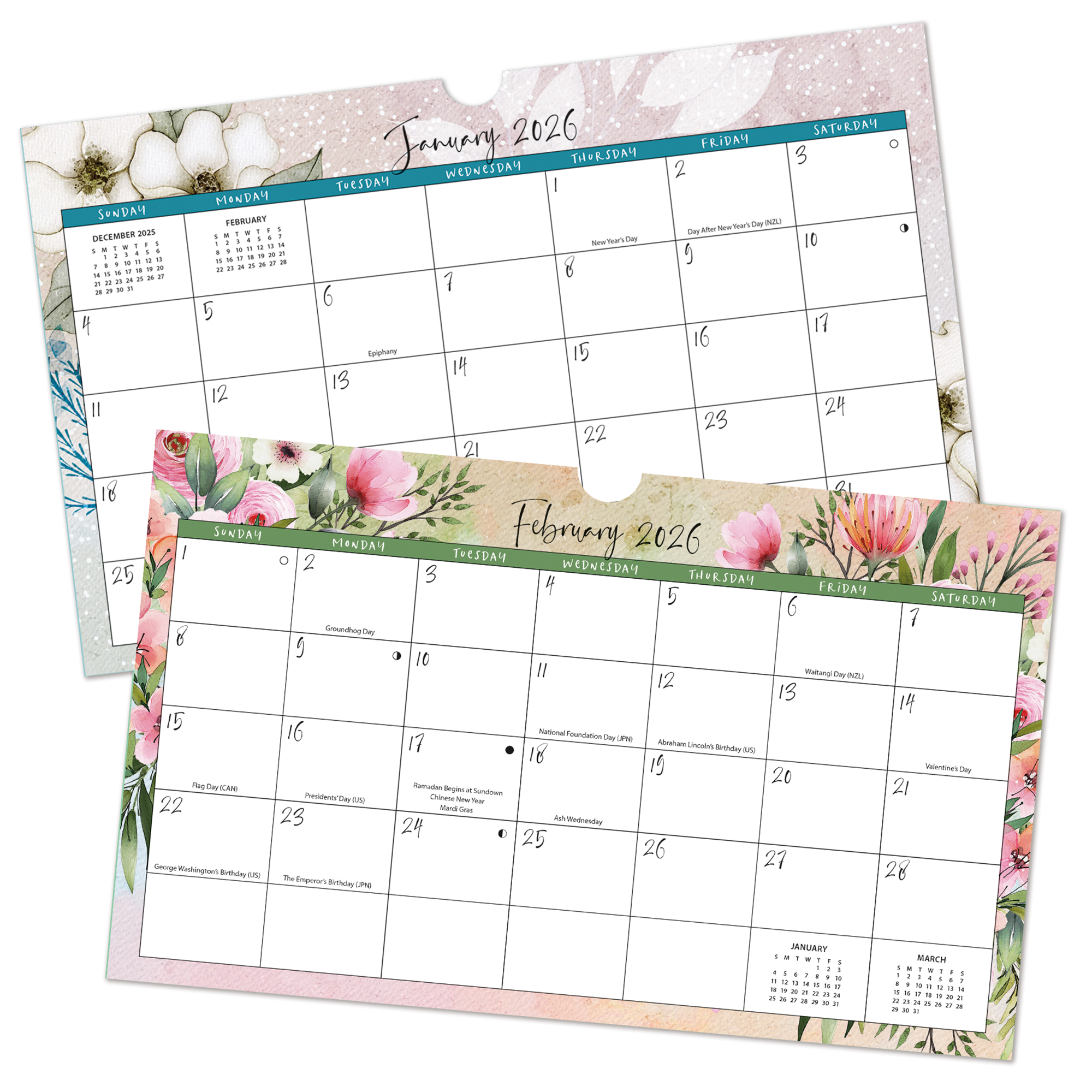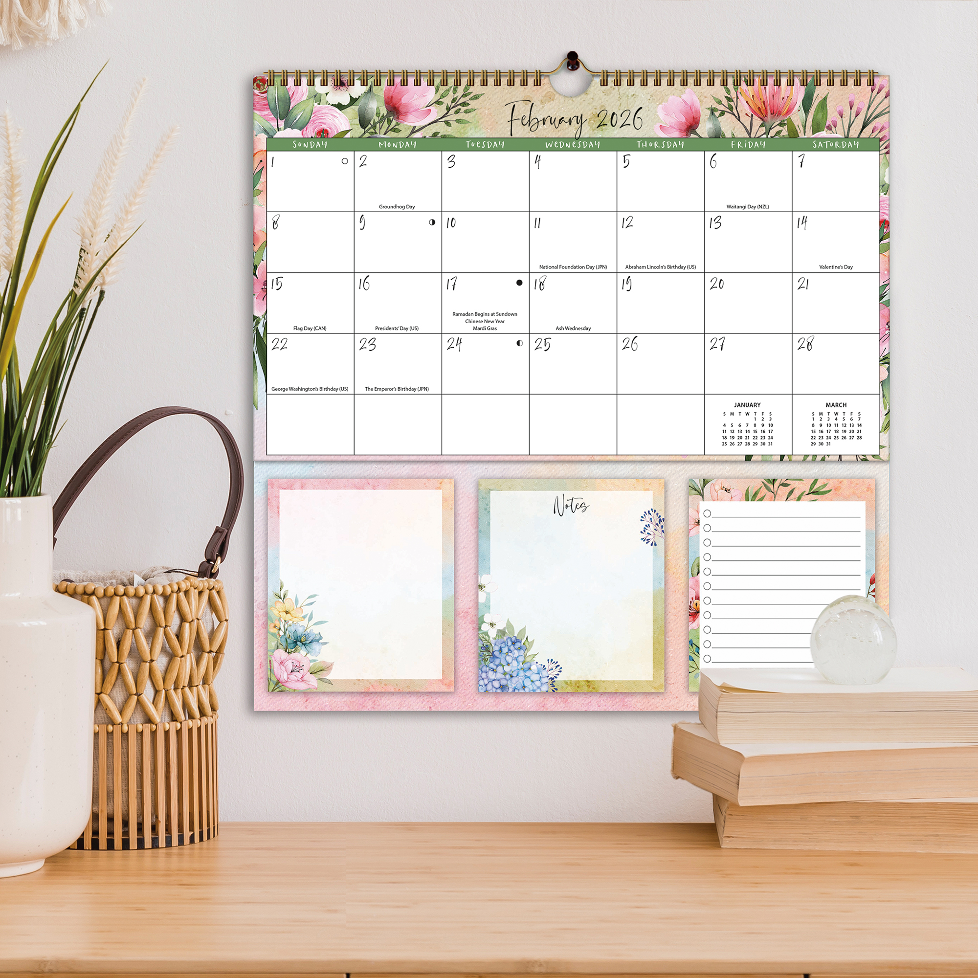 12-month format (January - December 2026); Full-color artwork and design throughout; Includes 2 note pads and 1 sticky note pad; Product Size: 12"w x 12.125"h x 0.46"d; Standard metal hanger plus optional magnetic strip