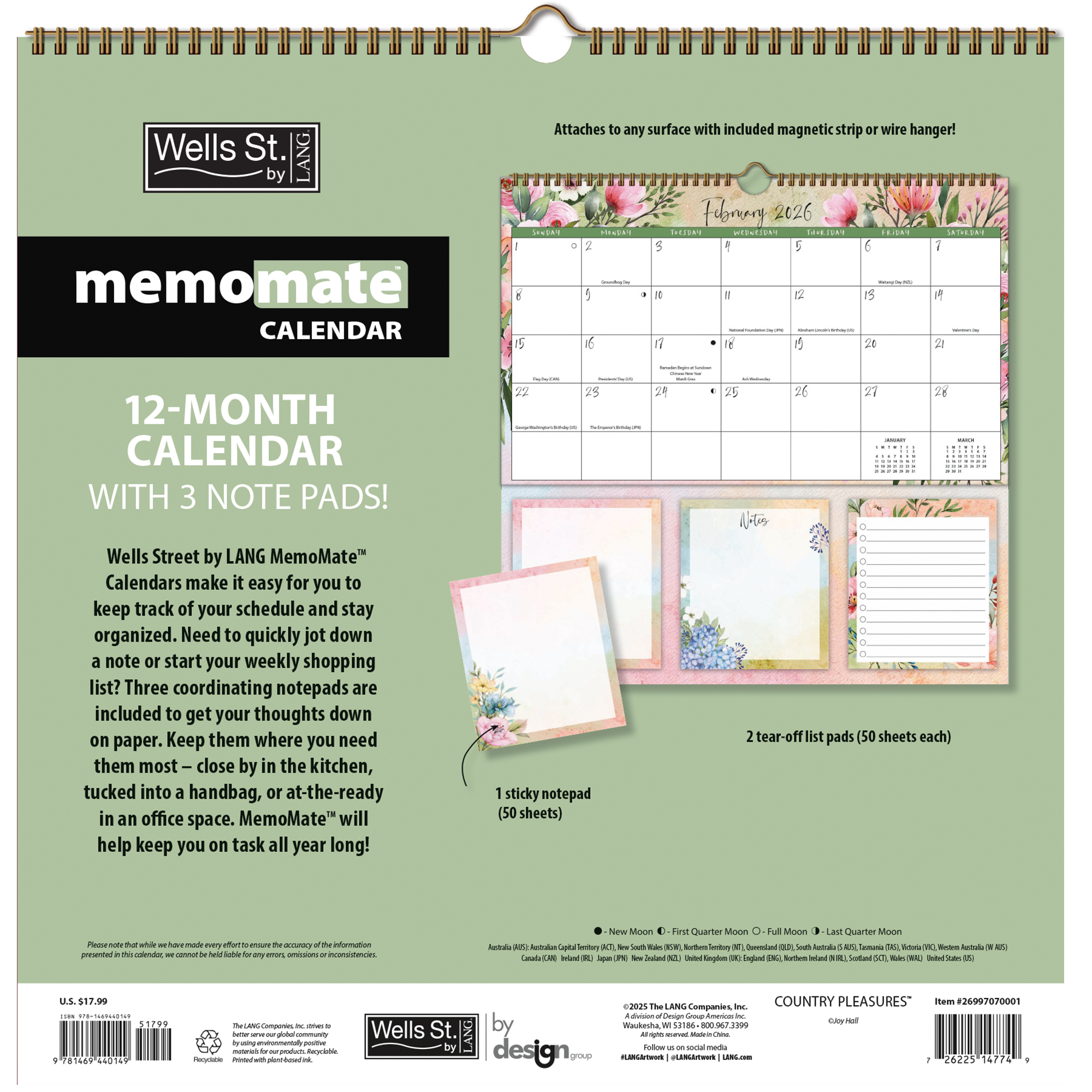 Elevate your planning with the Wells Street by LANG Country Pleasures 2026 MemoMate Spiral Calendar, featuring gorgeous artwork by Joy Hall. This 12-month calendar spans January to December 2026, blending functionality with beauty. Enjoy full-color floral artwork that bring each month to life, complemented by two convenient note pads and a sticky note pad for all your jotting needsSpecifications