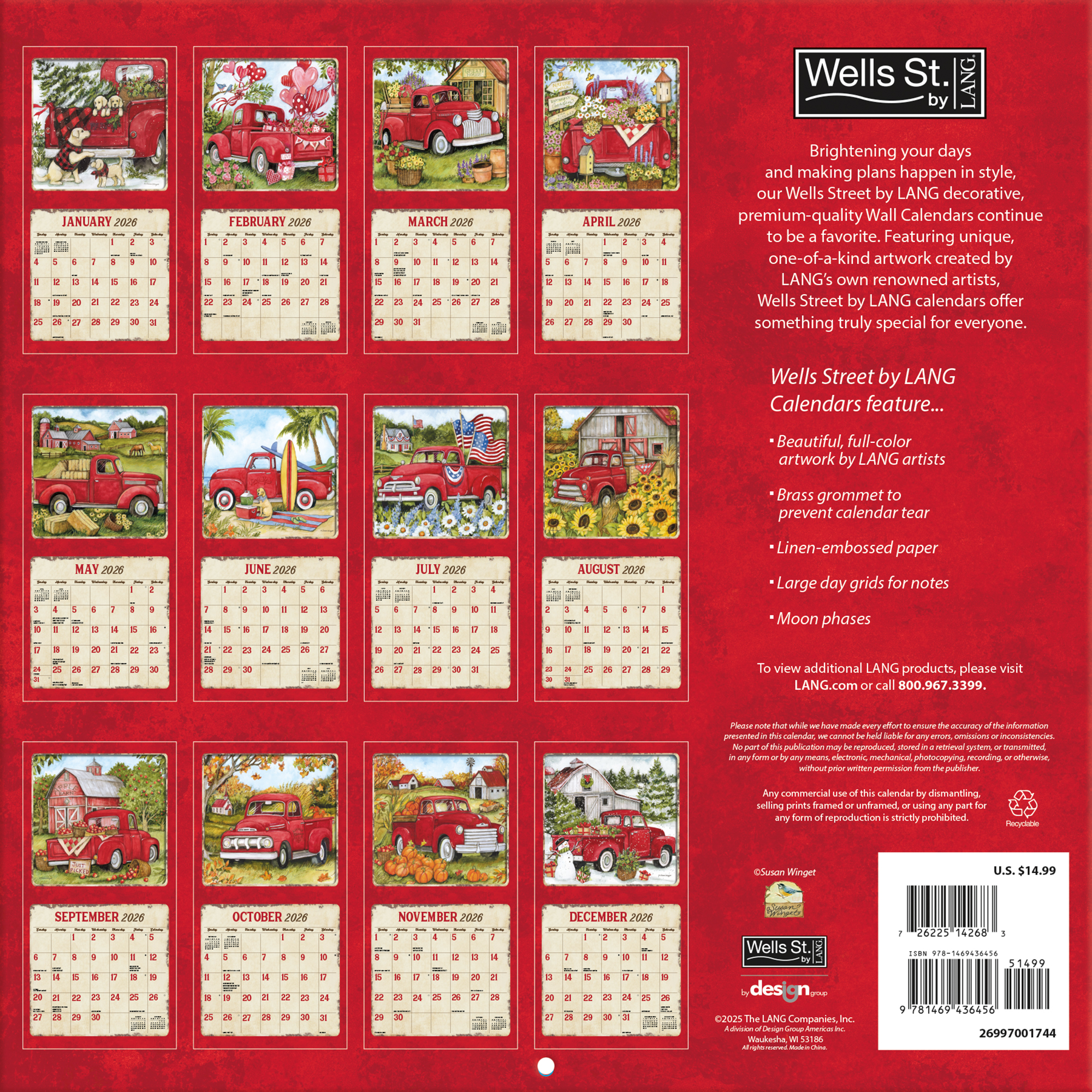 The Country Road 2026 Wall Calendar features monthly artwork by Susan Winget of her famous red truck. Wells St. by LANG Wall Calendars feature monthly full color images based on hand-painted originals, elegant linen-embossed paper stock, and a brass grommet for hanging.Specifications