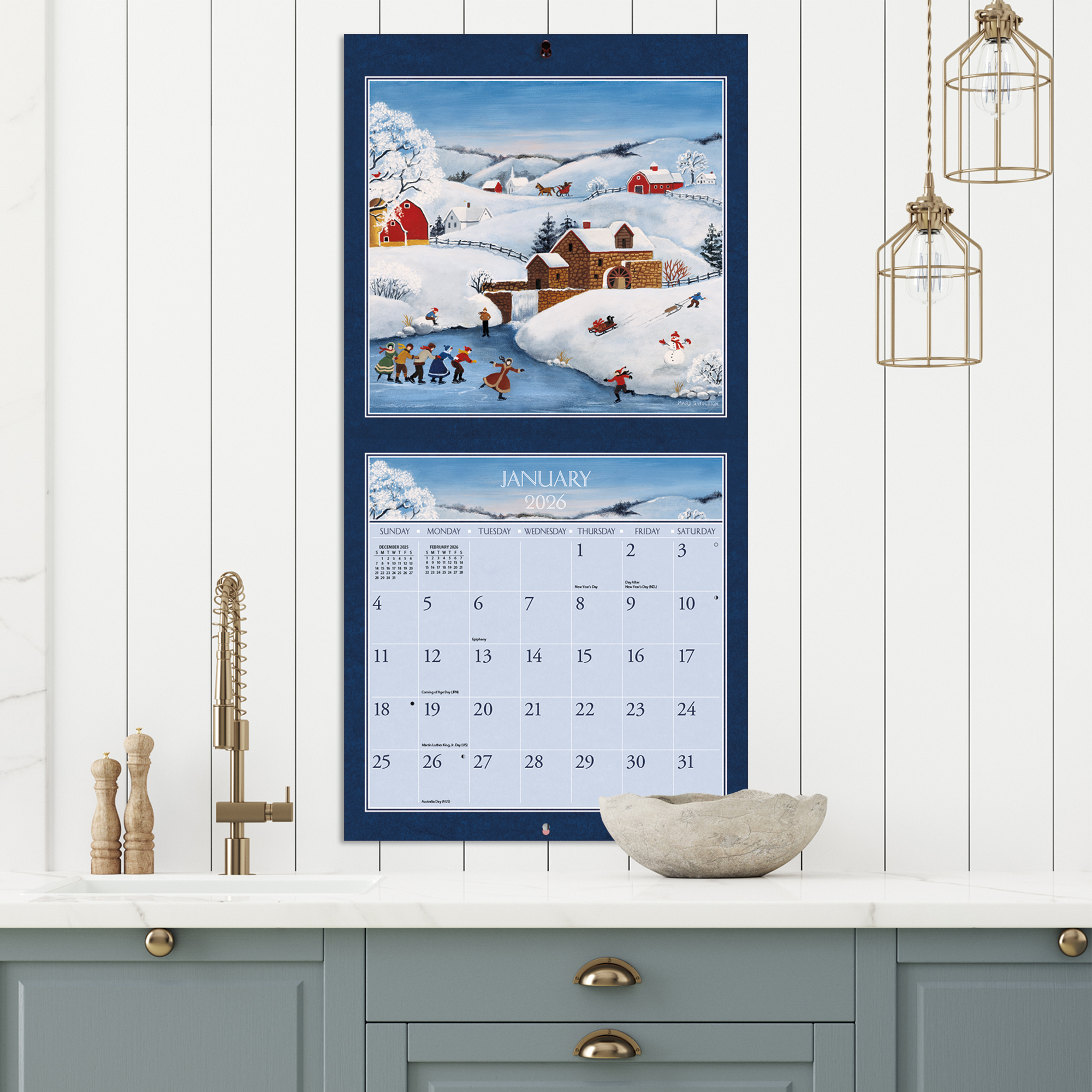 The Folk Life 2026 Wall Calendar features monthly folk art by Mary Singleton of townspeople in the rural countryside enjoying seasonal activities. Wells St. by LANG Wall Calendars feature monthly full color images based on hand-painted originals, elegant linen-embossed paper stock, and a brass grommet for hanging.Specifications