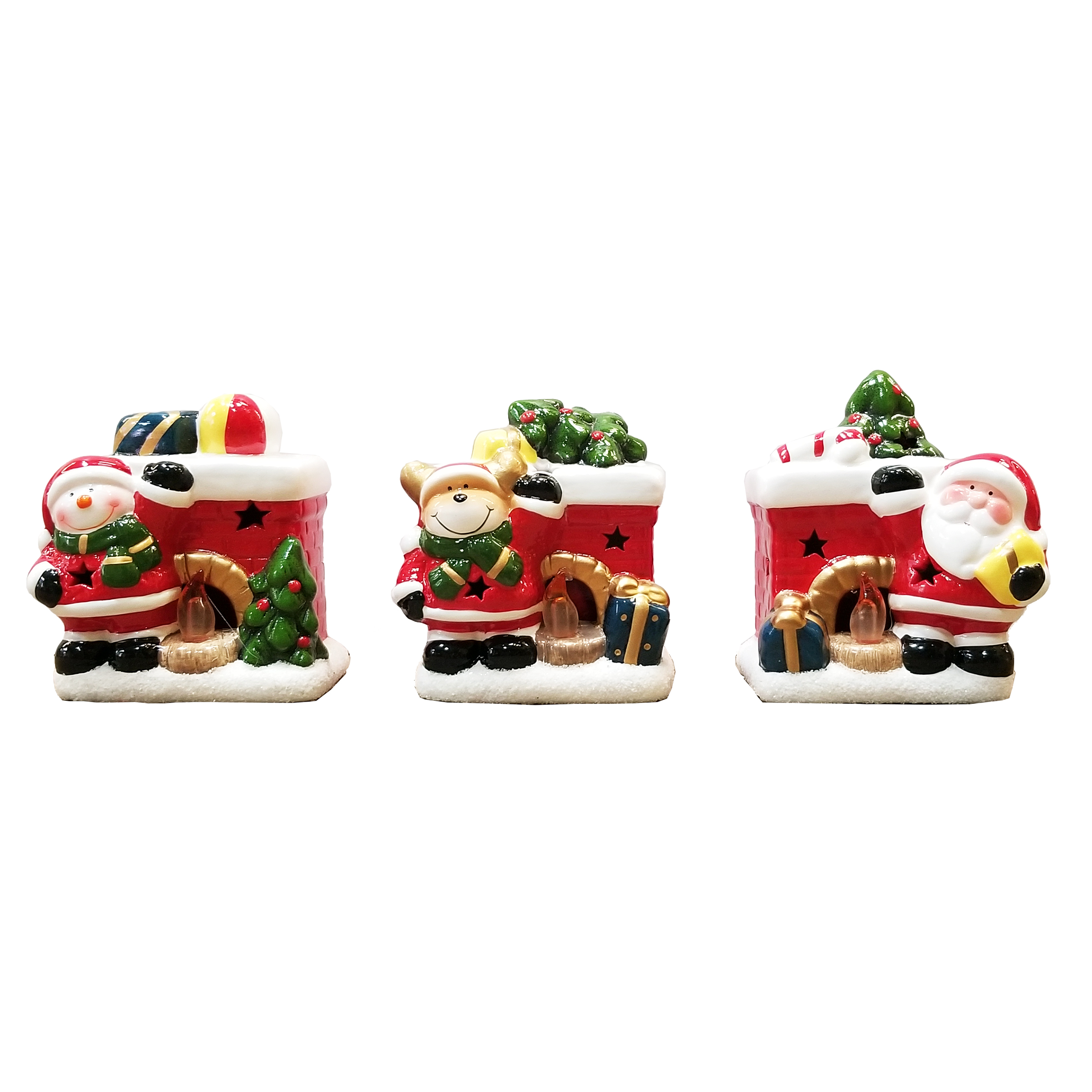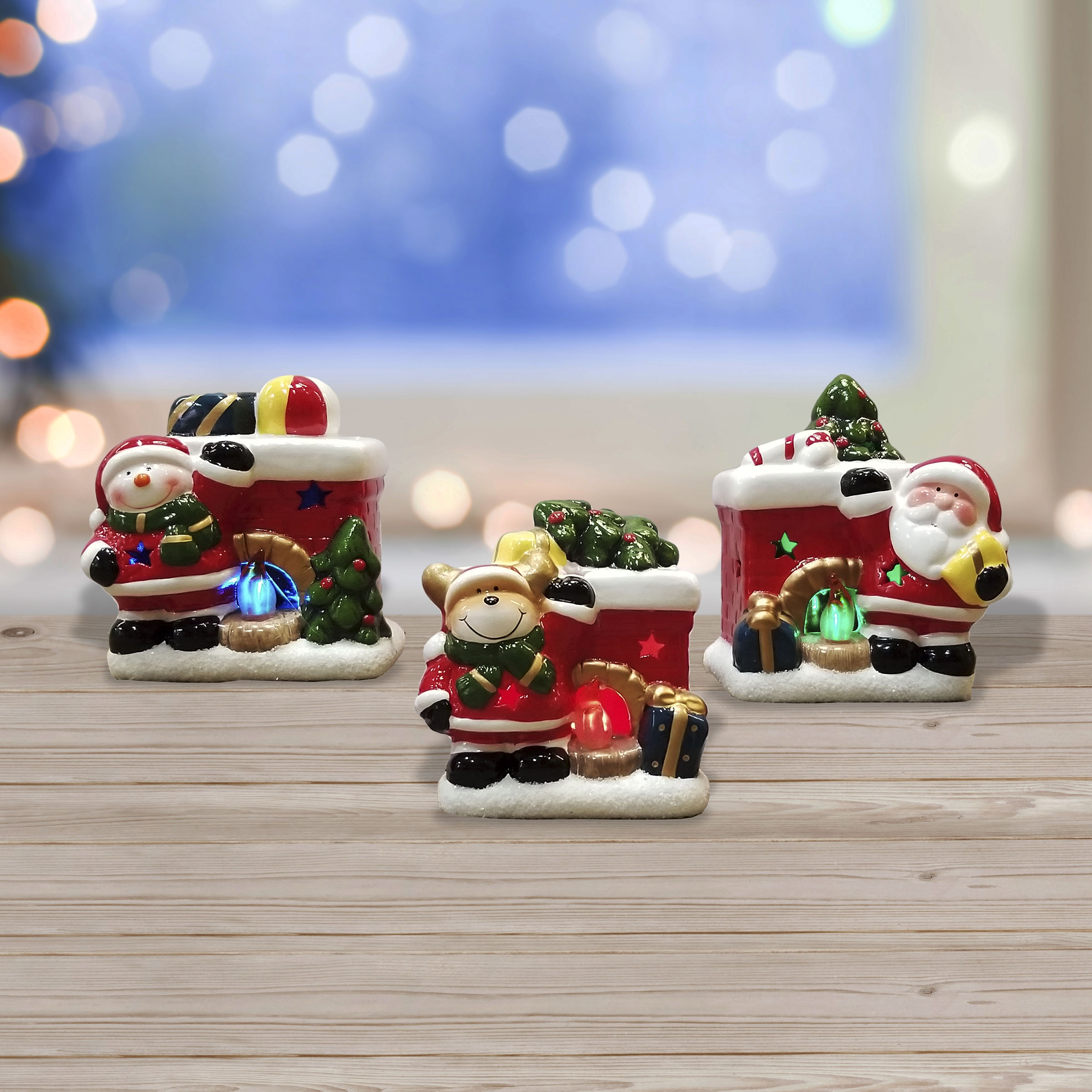 These charming holiday figurines feature a Santa, Reindeer, and a Snowman next to a fireplace with color-changing LED lights. The battery-operated holiday decor brings a joyful atmosphere to your indoor living space (batteries included). Display it on your mantel, table or anywhere you want to add a whimsical holiday accent. Each timeless and charming holiday figurine measures 4"L x 3"W x 5"H and is made of ceramic with a beautiful glossy finish. It also includes a one-year manufacturer's warranty from the date of purchase.Specifications