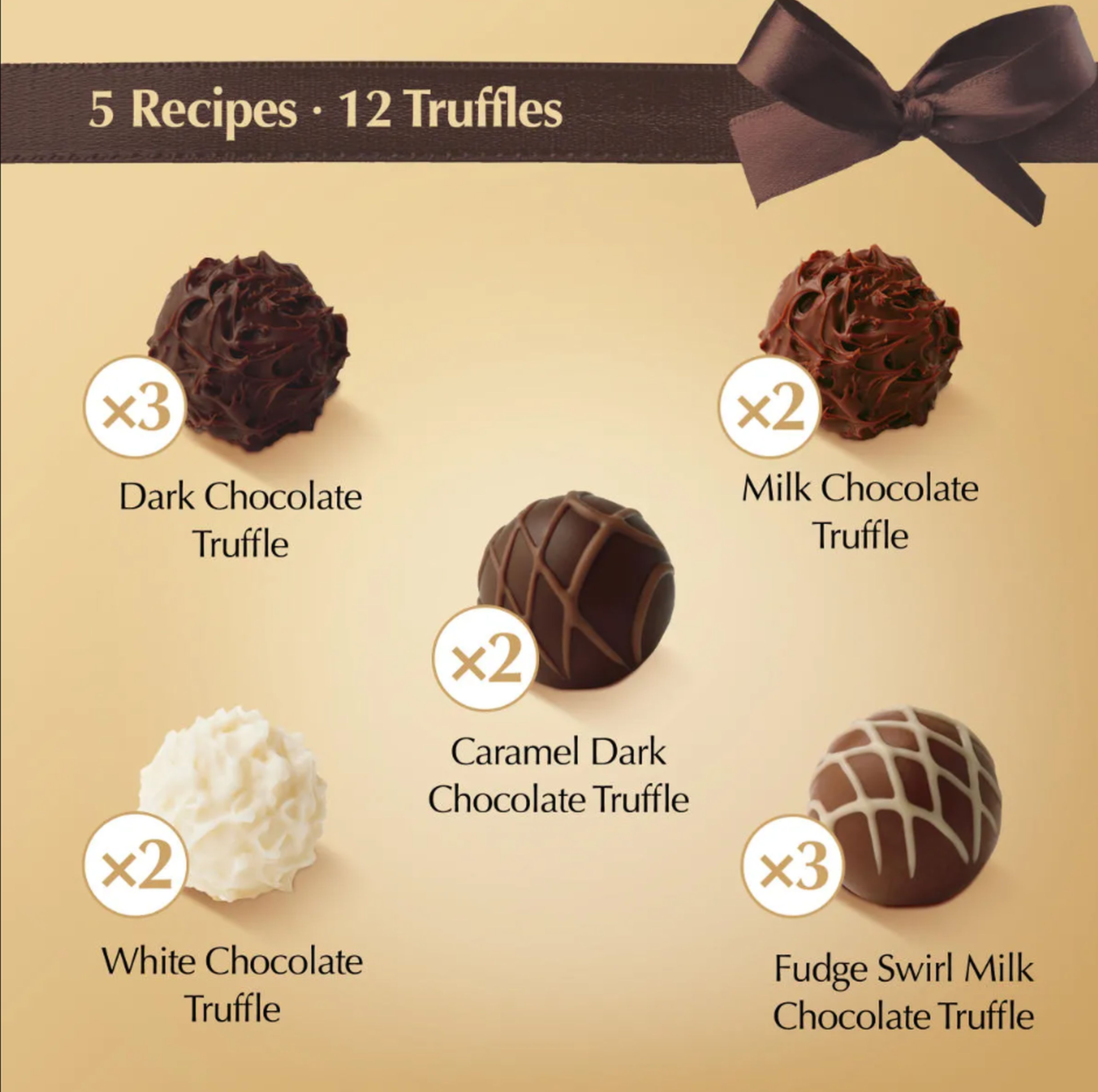 12 TRUFFLES; 6.8 OZ; CARAMEL DARK CHOCOLATE; DARK CHOCOLATE; FUDGE SWIRL MILK CHOCOLATE; GIFT BOX; MILK CHOCOLATE; WHITE CHOCOLATE